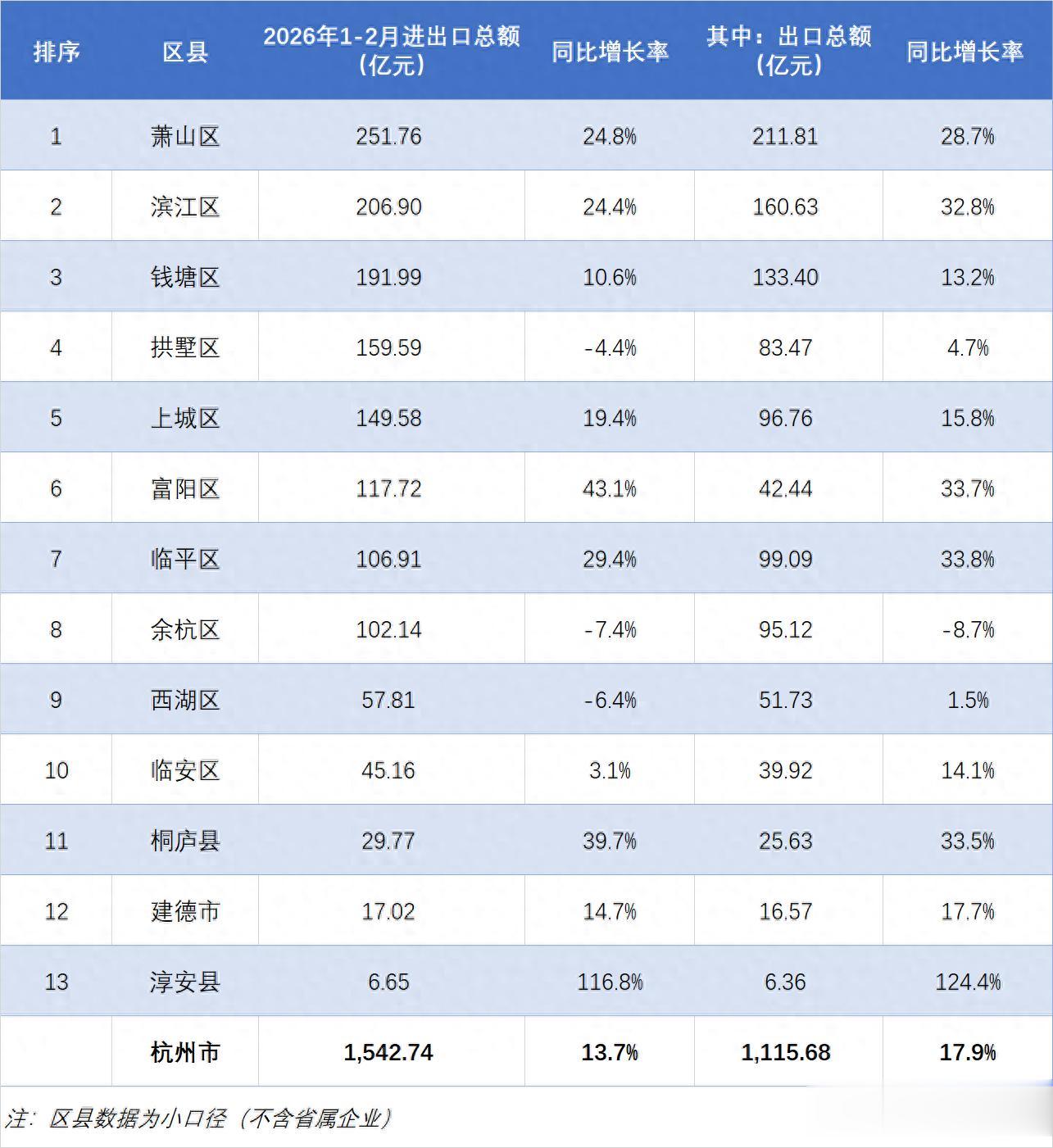 2026年1-2月进出口总额超过百亿的还有三区,分别是富阳区、临平区和余杭区,累计金额均在百亿出头,分别为117.72亿元、106.91亿元和102.14亿元。三地总量相差不大,实为伯仲之间,不过富阳区和临平区表现远胜余杭,增速分别高达43.1%和29.4%,居全市前列,未来可期!而余杭区同比则出现了负增长,降幅为7.4%,未来若没有更好表现,能否保住百亿还在未知之数,亟需尽快发力了。