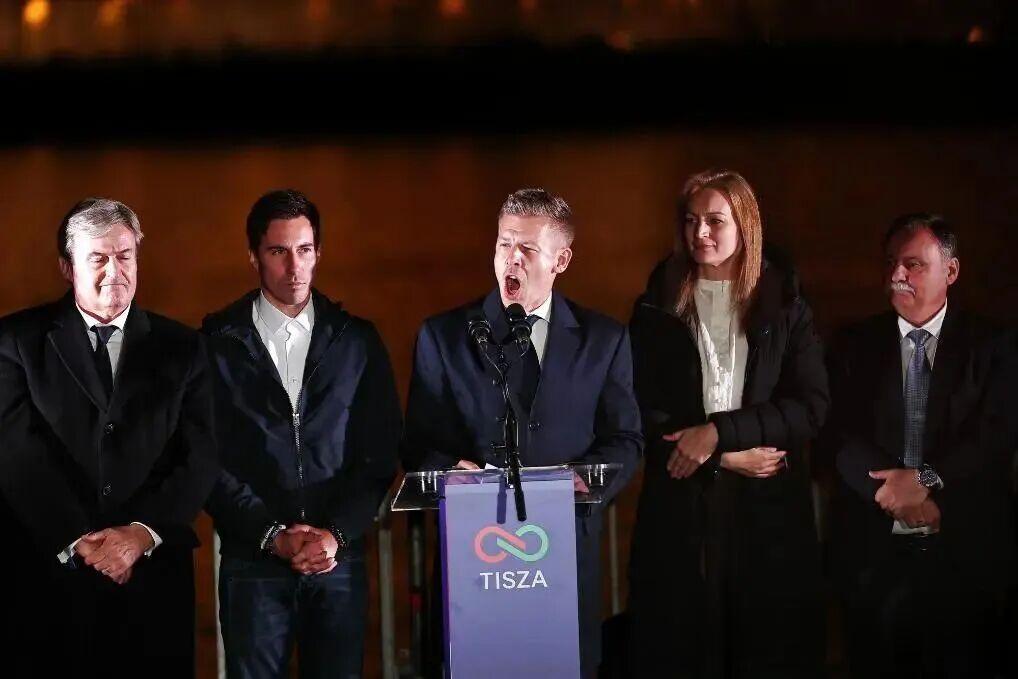 4月12日,在匈牙利首都布达佩斯,匈牙利蒂萨党领导人毛焦尔·彼得(中)在胜选晚会上讲话。新华社发(鲍洛格·达维德摄)