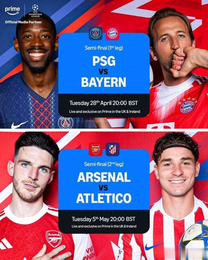 本轮欧冠半决赛首回合,巴黎主场5-4力克拜仁,阿森纳客场1-1战平马竞。