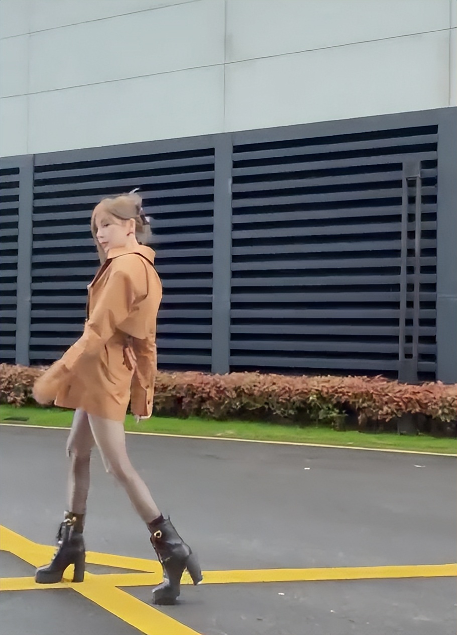 穿着一件卡其色的外套,搭配透色练腿袜,脚下踩着一双黑色的高跟皮靴,很有气场。