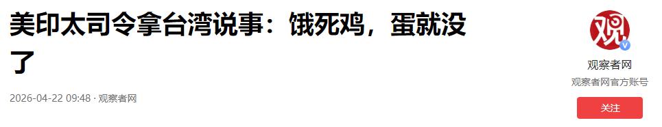 事情的导火索,是美军印太司令部司令帕帕罗跑到美国国会听证会公开喊话,逼着台湾通过一笔高达 400 亿美元的所谓防务预算。他还说了句很露骨的话,把台湾比作鸡,把防务预算比作喂鸡的饲料,说要是不喂饱鸡,把鸡饿死了,就拿不到鸡蛋。