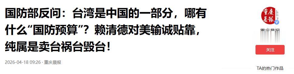这句话分量极重,从法律和法理上直接否定了所谓台湾防务预算的合法性,把美国整个操作的基础连根拔起。台湾作为中国的一个地区,根本没有资格谈什么国防,美国和民进党当局搞的这套把戏,完全是违反一个中国原则、干涉中国内政的违法行为。