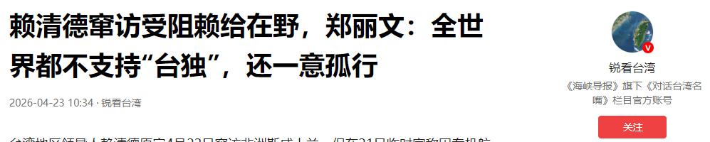 最近赖清德计划窜访非洲,结果途经国家纷纷取消飞航许可,行程被迫取消。郑丽文直接点破,全世界都坚持一中政策、没人支持 “台独”,民进党对外处处碰壁,只能认清现实,减少谋 “独” 挑衅,不再把台湾绑上 “台独” 战车。