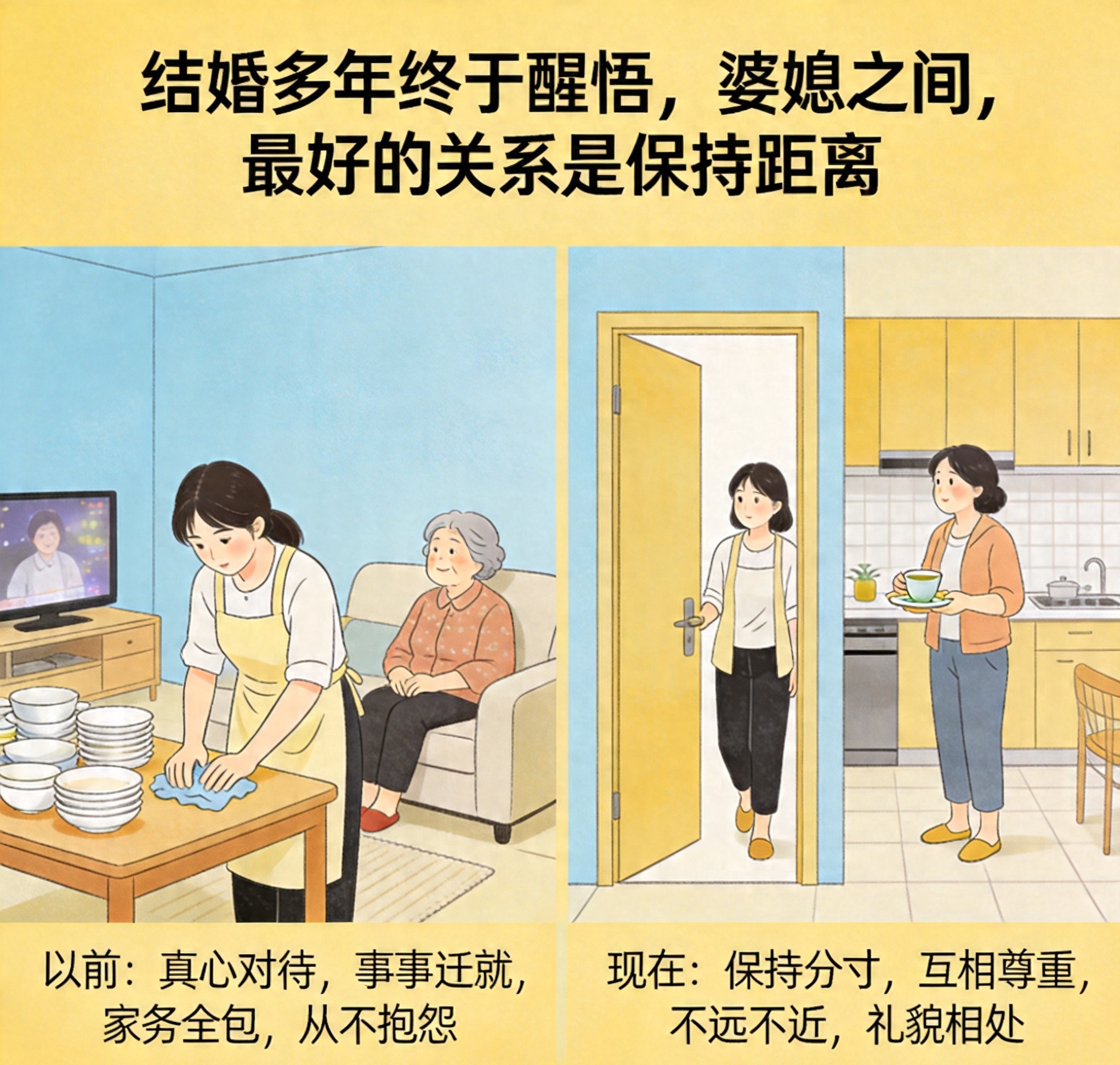 婆媳不是母女,没必要走得太近,保持分寸,互相尊重。