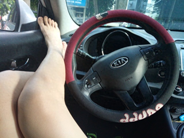 车里坐着一位姑娘,化了很浓的妆,穿着一件蕾丝上衣。她脱了鞋,光着脚,轻轻搭在方向盘上,整个人懒懒地靠在座椅里,歪着头,笑着跟老师打招呼。