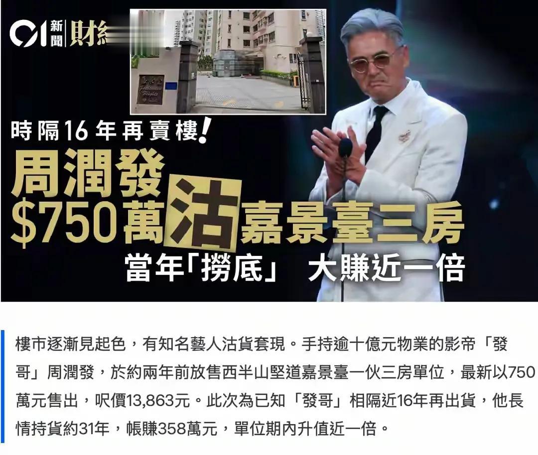 4月20日,有消息称,周润发最近成功成交了一套小户型,距离他上次售出房产已经过去16年了,那回卖房纯赚一千多万,得益于当时香港楼市的供销两旺。