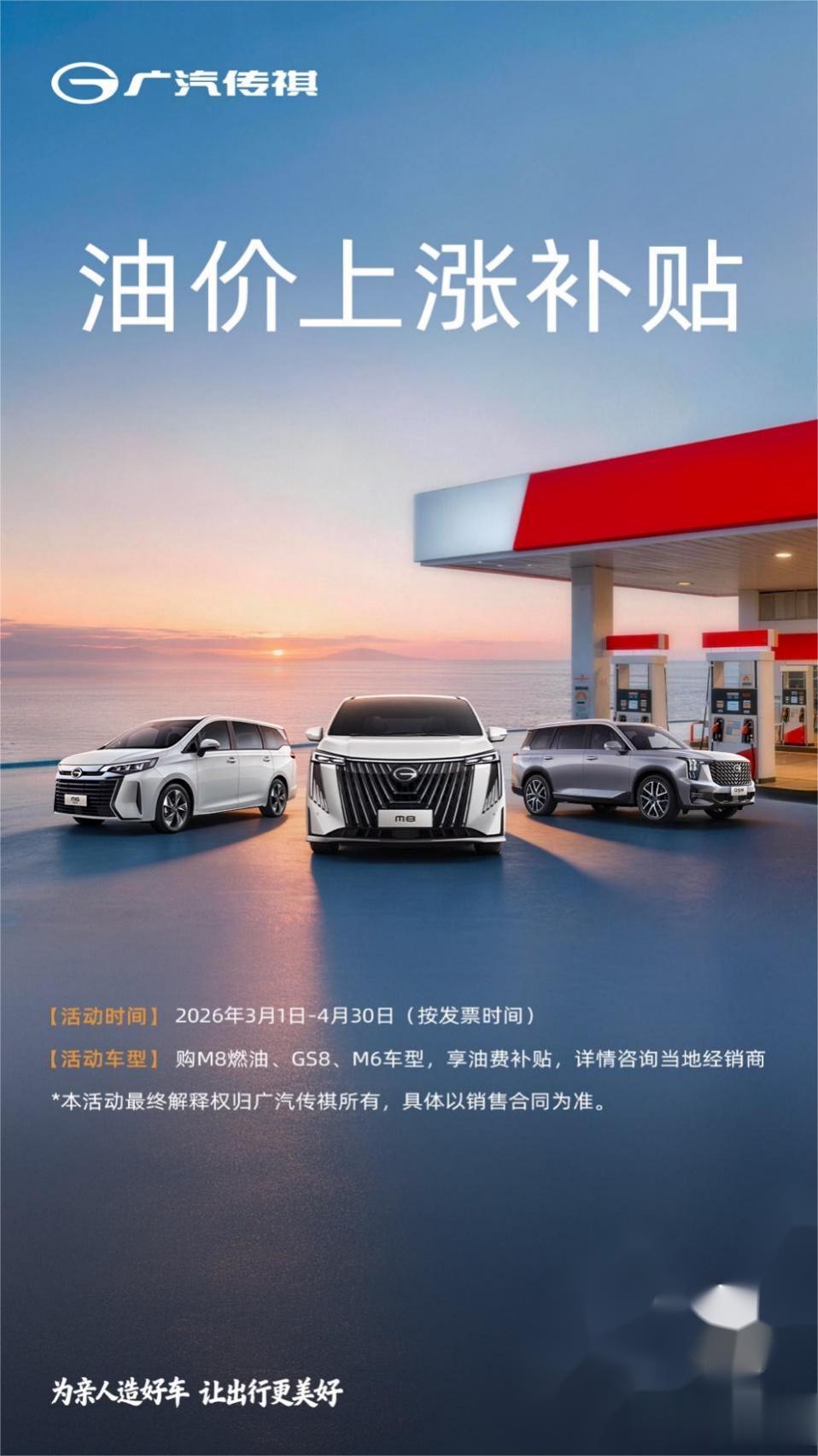 此外,传祺始终深度洞察用户痛点、始终立足用户真实所需。针对近期油价走高的市场行情,面向燃油车主暖心推出专项油价上涨补贴福利:对2026年3-4月购买传祺M8燃油、GS8、M6车型的客户,传祺将补贴因本轮油价上涨额外增加的用油成本,切实减轻用车成本,以真心举措传递温情关怀。