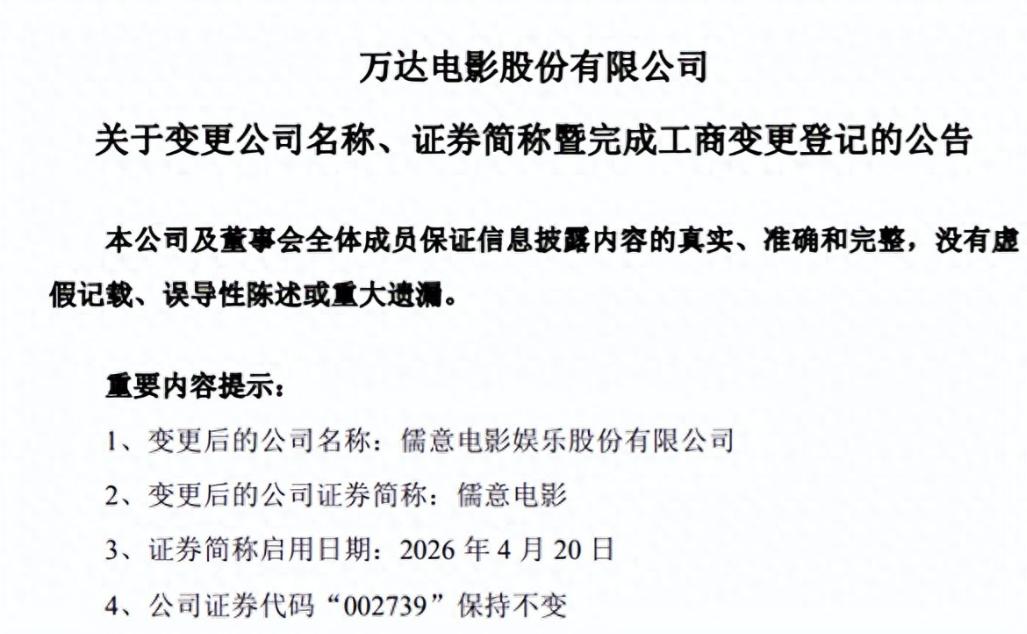 万达电影“消失”今年4月20号,儒意电影公司正式接管了万达电影,“万达电影”这个名字以后就不会再出现了。
