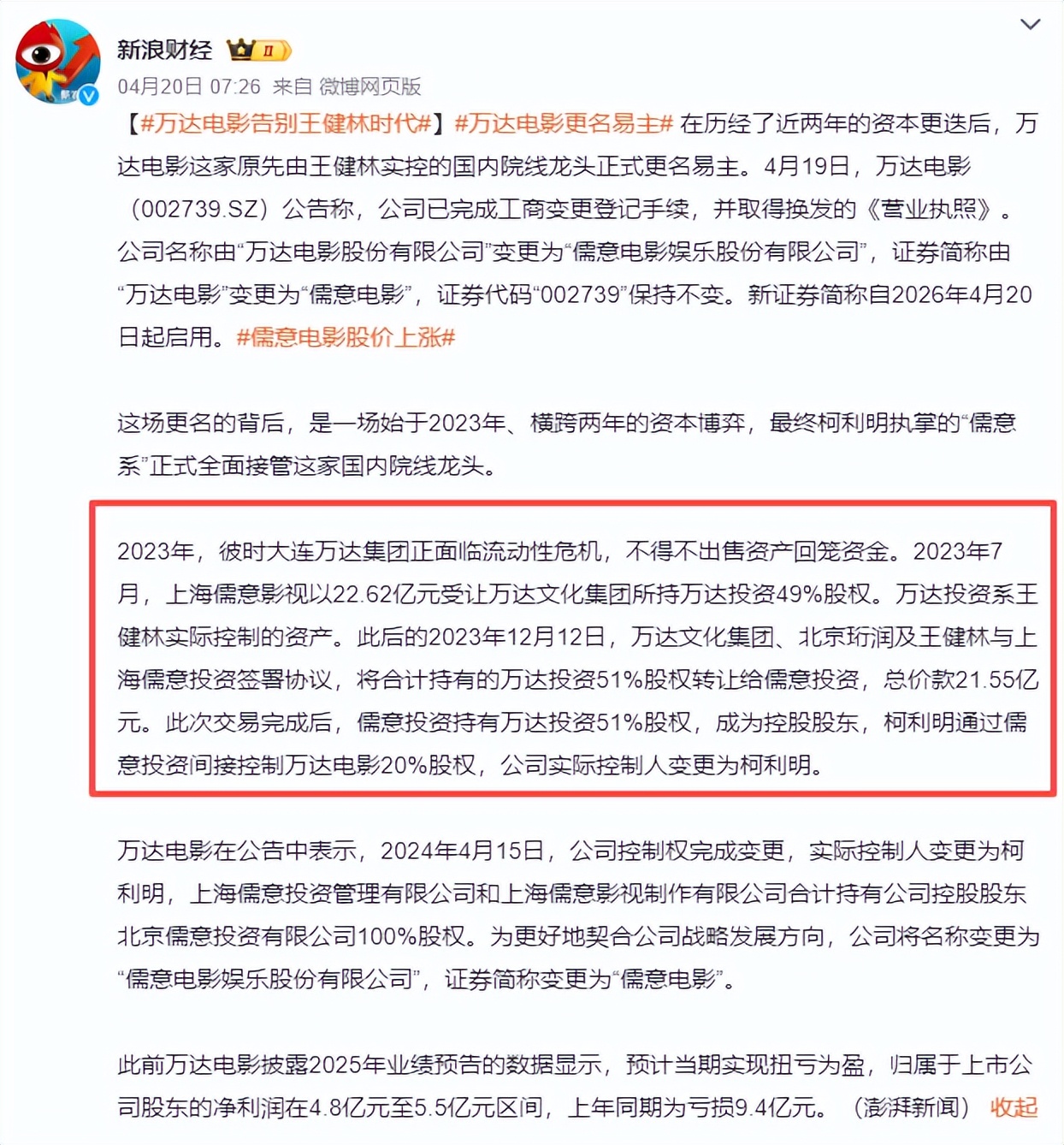 几个月后又把剩下的股权全都卖给儒意,也就是说从两年前开始,万达电影实际上就已经不存在了,就只是剩下了个“皮”。