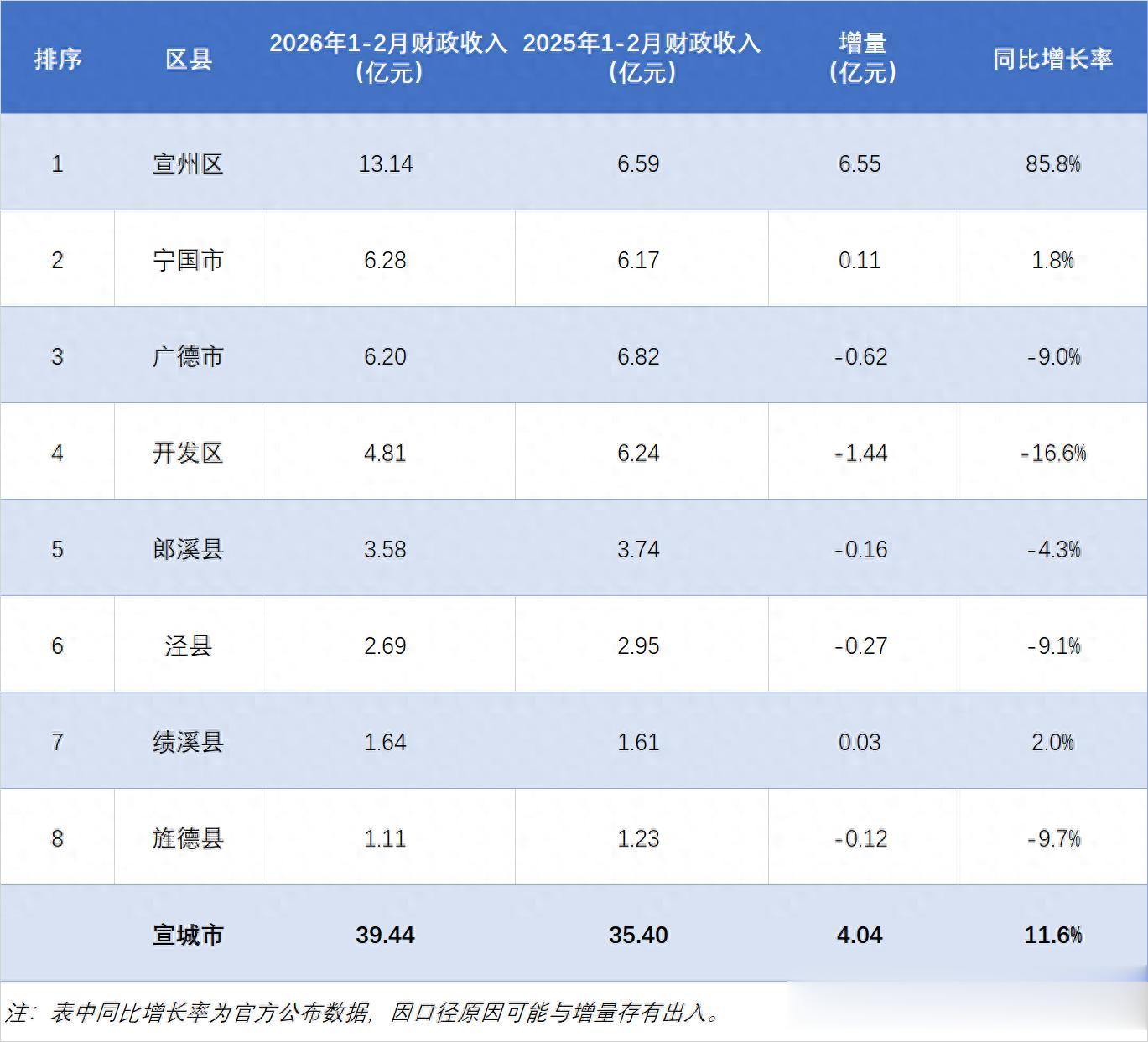 宣城市地处安徽东南,与江苏、浙江均有交界,为长三角腹地。根据统计部门公布的数据,2026年1-2月份,宣城全市共实现地方财政收入39.44亿元,较上年同期增加4.04亿元,同比增长率为11.6%,总体势头不错。