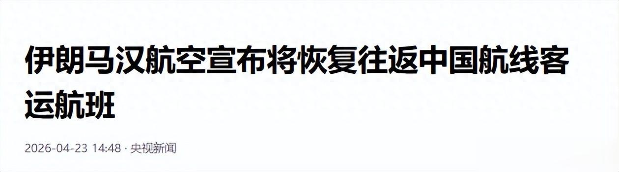 据央视新闻在2026年4月23日的报道称,伊朗马汉航空发布公告,宣布将恢复伊朗往返中国航线客运航班。公告显示,自2026年4月26日起,马汉航空将逐步恢复伊朗往返中国的客运航班运营。先期公布2026年4月26日至5月25日航班计划,后续航班信息将另行通知。这意味着伊朗航空仅剩的几架大型货机,客机,首先恢复到中国的航线。在美军,以色列对伊朗发动模拟打击前,给伊朗制造紧张之时,伊朗宣布重新开放领空,美国国务院紧急宣布:“伊朗重开领空,要求本国公民立即离境。”