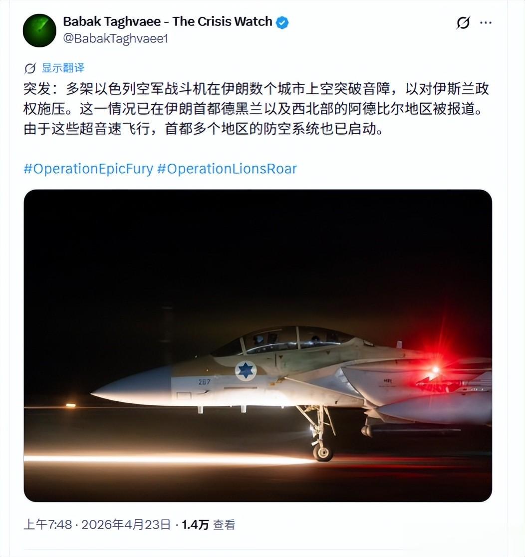 除了美军发射诱饵巡航导弹, 欺骗伊朗防空导弹部队开火之外,据称,多架以色列空军战斗机在伊朗数个城市上空突破音障,以对伊朗施压。由于以色列空军F-35I等战斗机进行超音速飞行,伊朗首都德黑兰等多个地区的防空导弹系统也已启动。伊朗方面声称,在4月22日晚间,伊朗正在进行的活动是一场防空演习,也是对伊朗防空系统战备情况的测试。还有报道称,多枚防空导弹在德黑兰西南和西部自爆,据称是由伊朗革命卫队发射了,俄制道尔-M1短程防空导弹导致的。