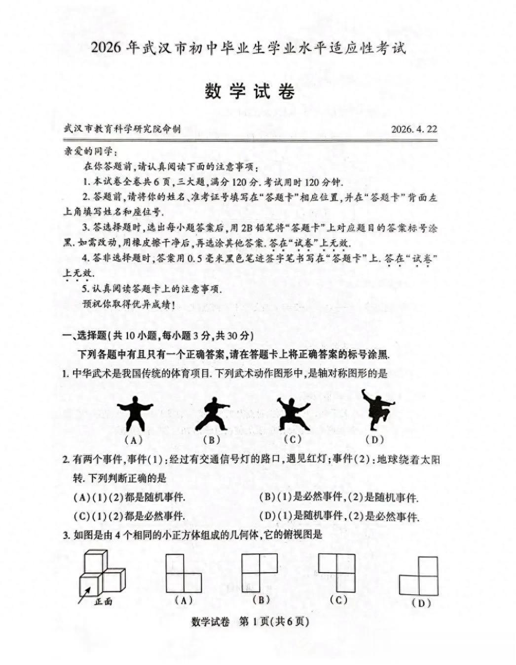 “江城年味浓,出行热度高”“美美和好好玩数字卡片”“小梅去体育馆锻炼”……2026年武汉市初中毕业生学业水平适应性考试数学试卷,今天(4月22日)正式开考!这份由武汉市教育科学研究院命制的“中考风向标”,不仅藏着浓浓的武汉烟火气,更被考生吐槽“题题有陷阱,步步是考点”!