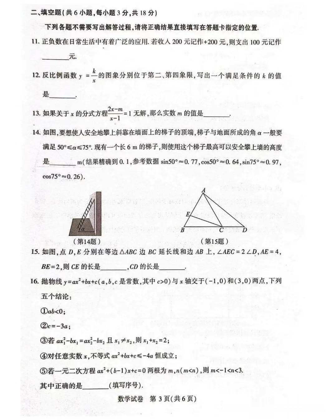 二、填空题:梯子安全角度、抛物线5结论判断,第16题成“学霸试金石”第14题“梯子靠墙”问题,给足sin50°、cos75°等数据,看似送分,却有人把“最高安全高度”算成“最低高度”;第15题等边三角形里藏角度关系,AE=4、BE=2,求CE和CD,考生:“两个空,第一个空算对了,第二个空直接蒙!”