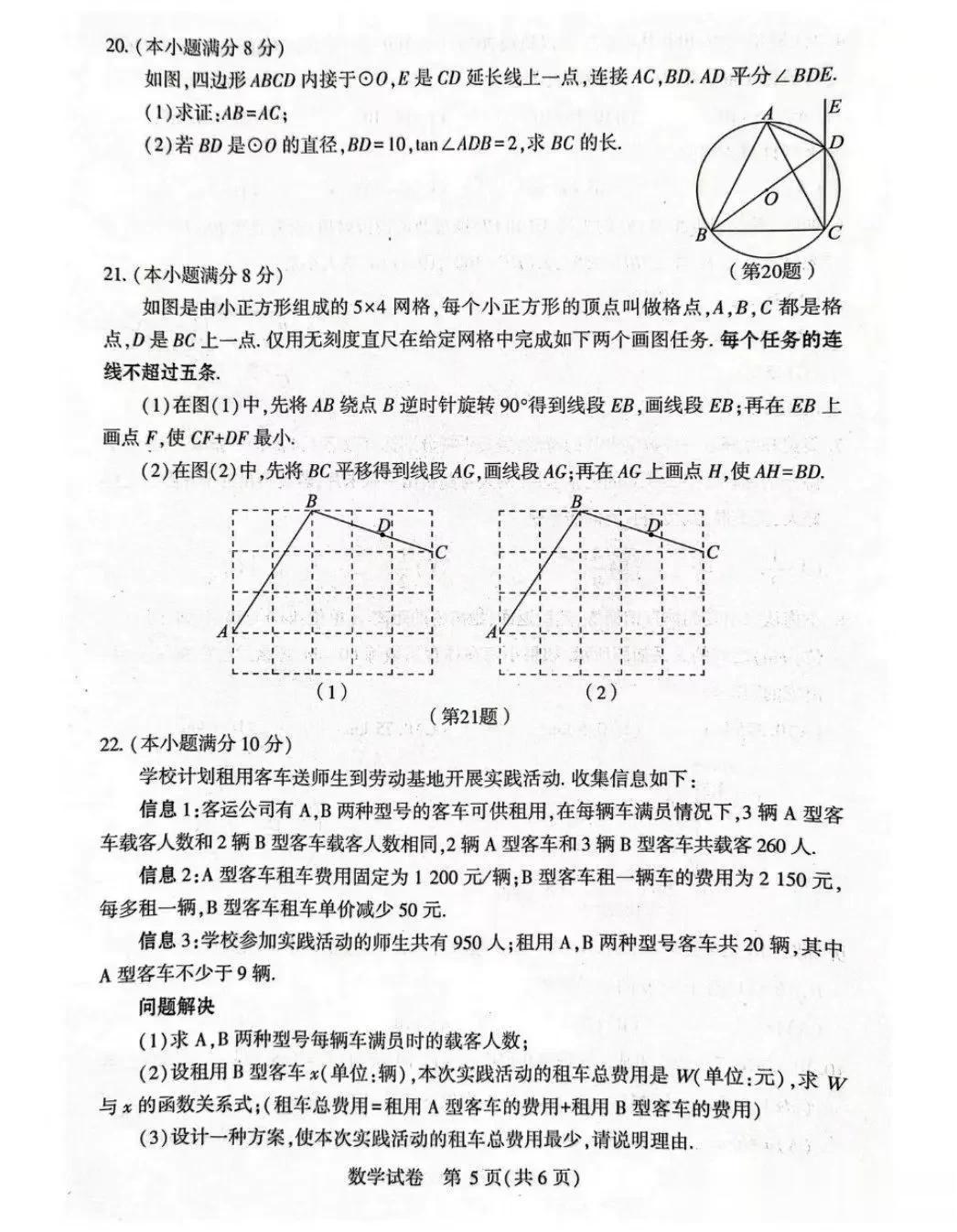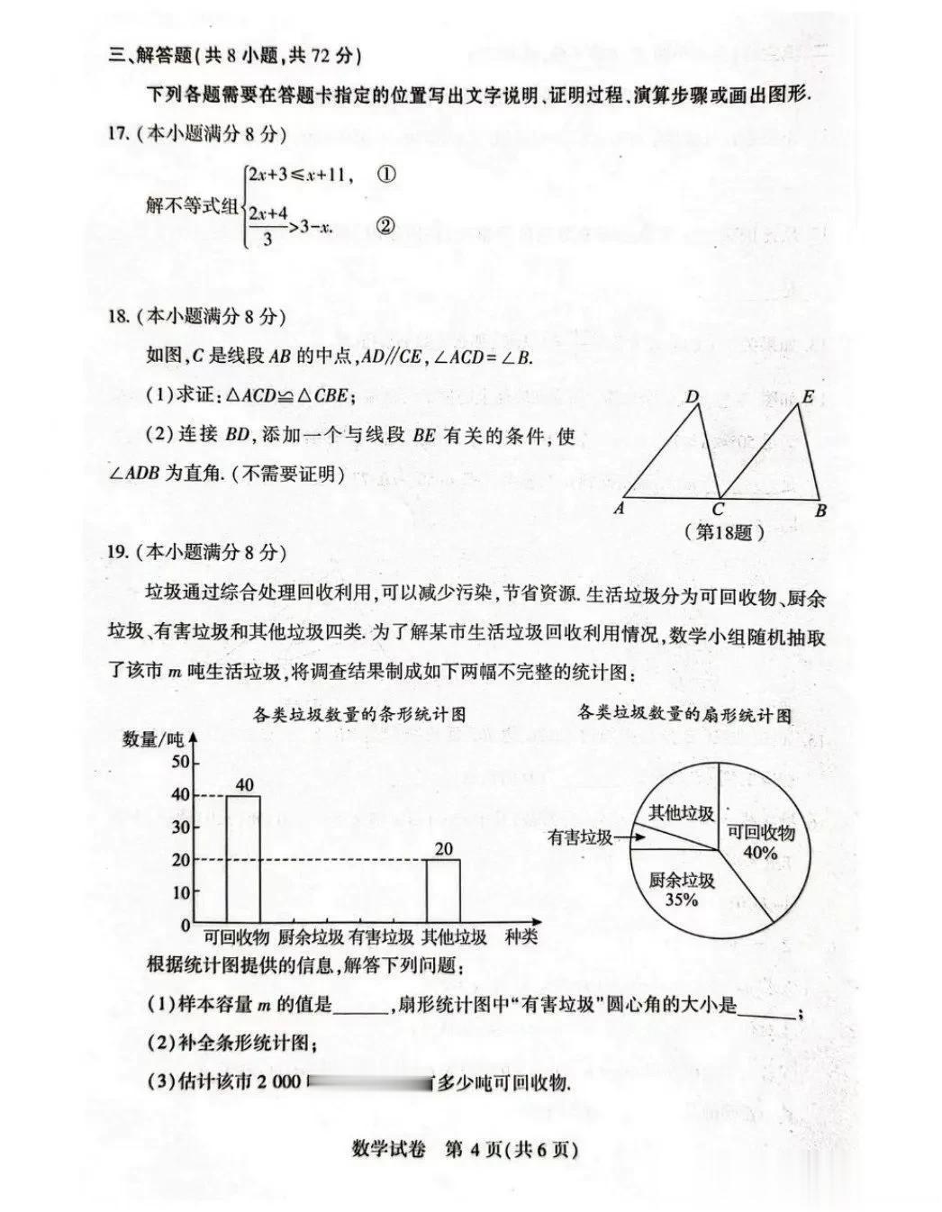 第19题“生活垃圾回收”统计,条形图+扇形图结合,求样本容量、圆心角、估计总量,考生:“这题要是错,回家得被爸妈骂‘生活常识都没’!”;第22题“租车送师生”,A、B两种客车载客量、费用、数量限制,三元一次方程+一次函数最值,考生:“算到最后发现租A型车9辆时费用最低,但差点忘了‘不少于9辆’的条件!”