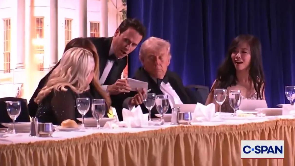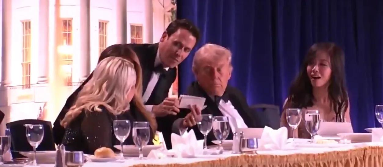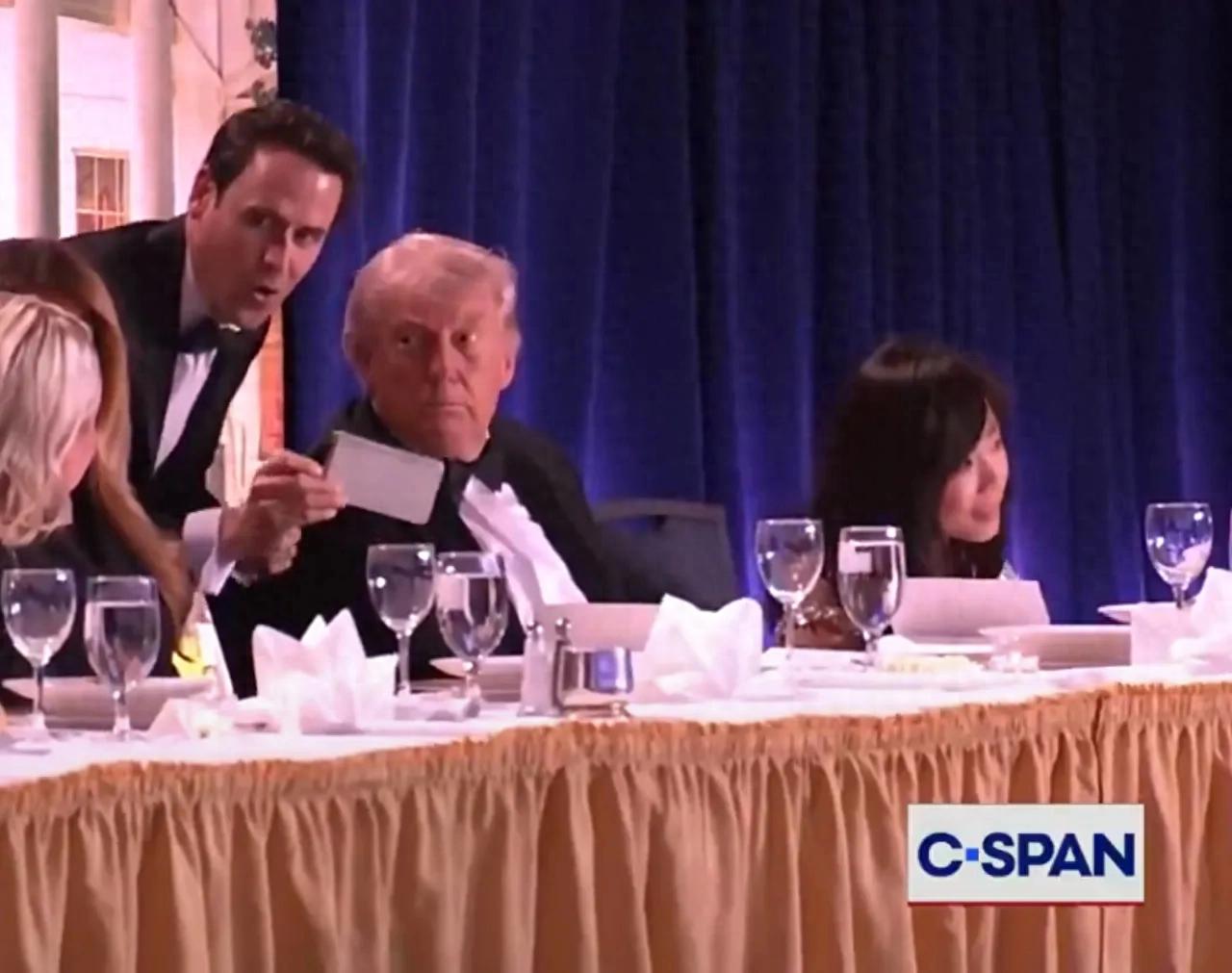 当时,现场觥筹交错,能听到杯盘碰撞的清脆声音,特朗普与夫人坐在主席台上,一名男子拿着纸条与特朗普交流!