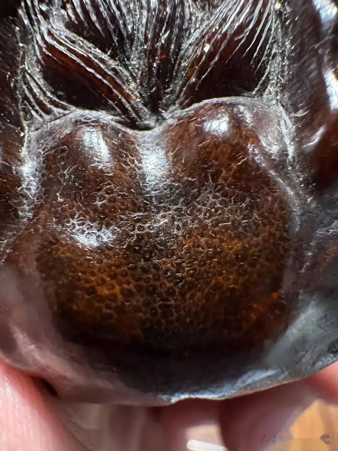 这件古兽老犀角雕件的雕工水平还是很高的,有深雕,走刀简约流畅。古兽额头这个部位经常盘玩,已经变得油光可鉴。放大贴近上面还能看到颗颗鱼子纹理。