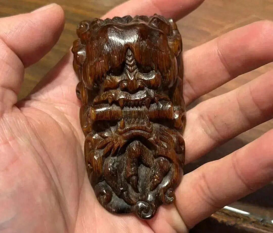 本人收藏的一款老犀角雕刻把件,造型很奇特。是一种看起来凶悍的古兽,但是不太敢确定这是哪一种古代神兽。这神兽嘴咬一圆柱的东