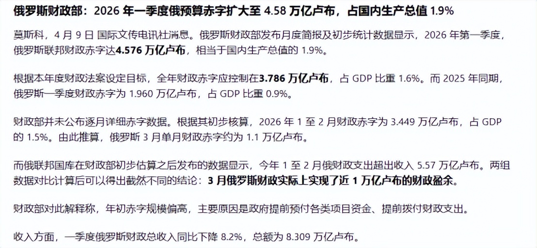 俄罗斯财政部在4月9日发布了报道,今年第一季度的联邦预算赤字达到4.5万亿卢布,相当于GDP的1.9%,为了填补财政赤字,俄政府只能向民众增加增值税,直接后果就是加大民众的生活成本。