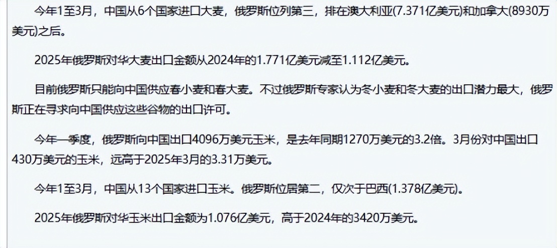 此外,中国从俄罗斯进口农产品270万吨,出口量增长 29%,出口额增长 43%,达 24亿美元,其中小麦是去年同期的3.5倍;玉米是3.2倍,大麦是1.5倍。