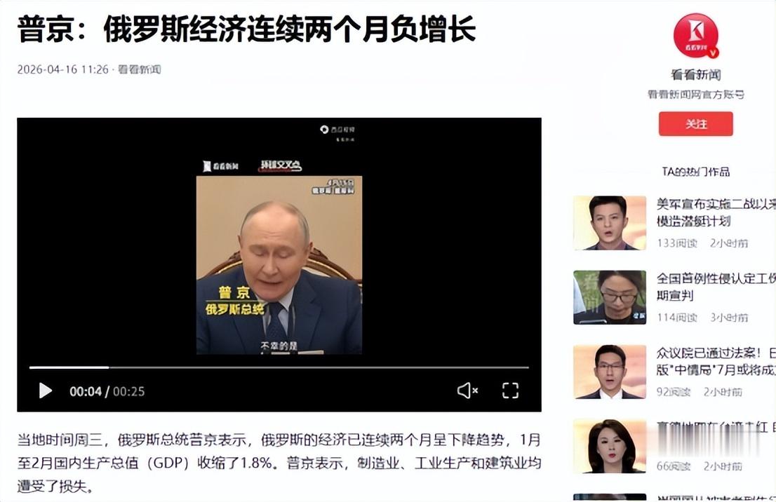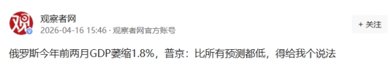 【信源:观察者网2026-4-16俄罗斯今年前两月GDP萎缩1.8%,普京:比所有预测都低,得给我个说法