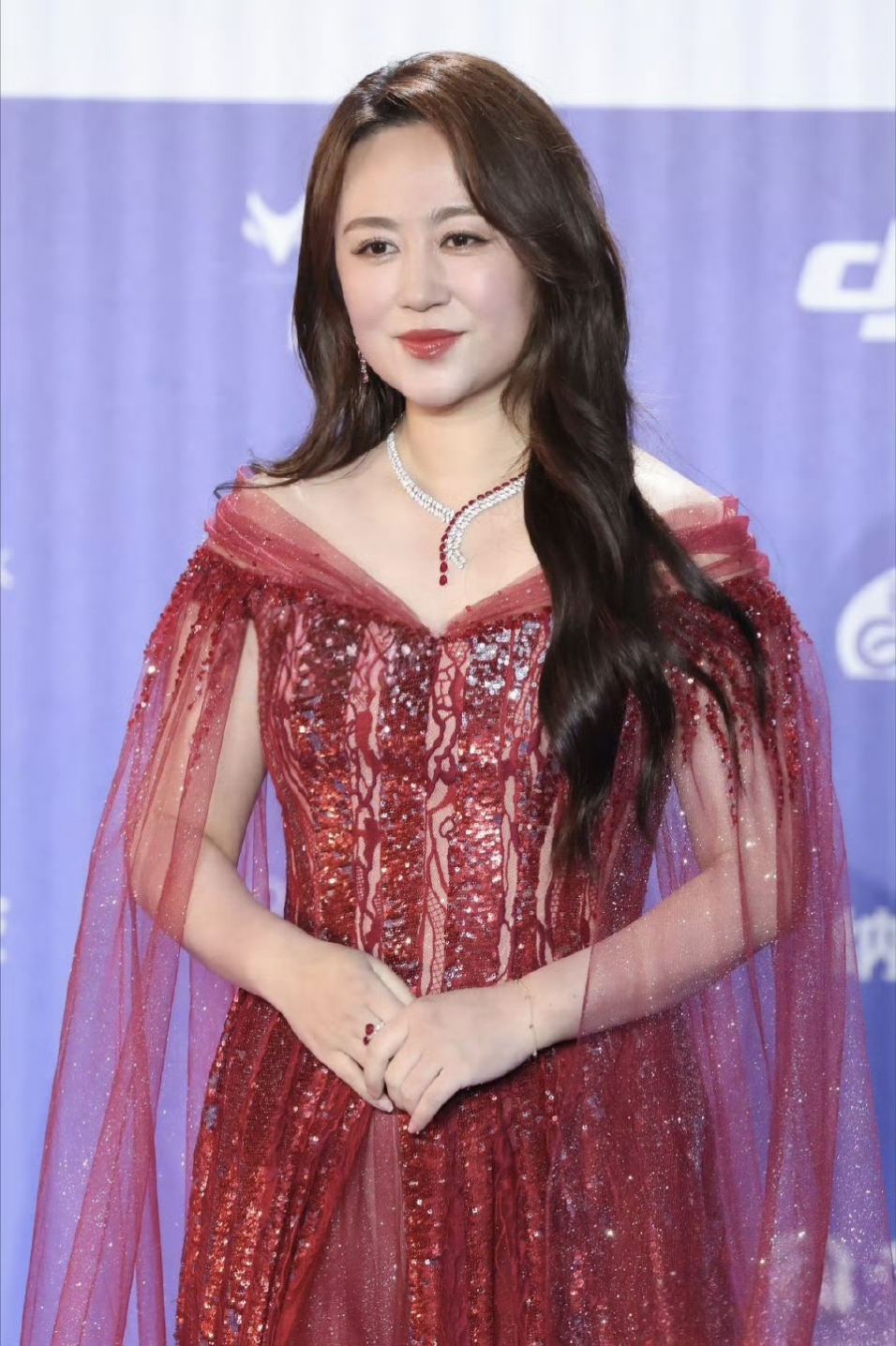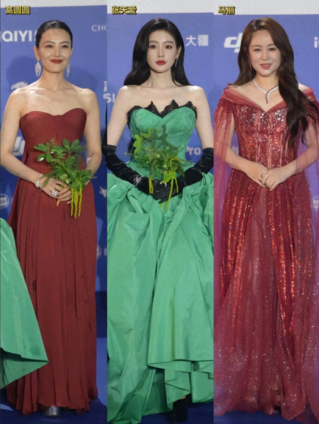 马丽则是一袭大红色亮面红裙,喜庆又吸睛,原来搞笑女也能轻松驾驭妩媚风情。