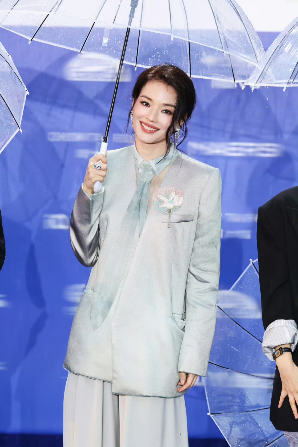 49岁舒淇身穿新中式绸缎套装亮相,利落干练自带高级感,本应稳站焦点。奈何春雨连绵,底妆与眼妆被雨水晕染,面对镜头稍显局促,少了几分从容。