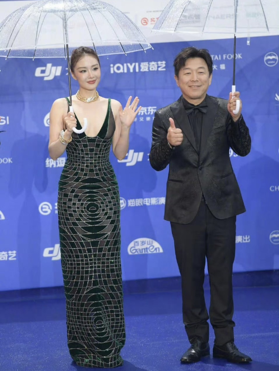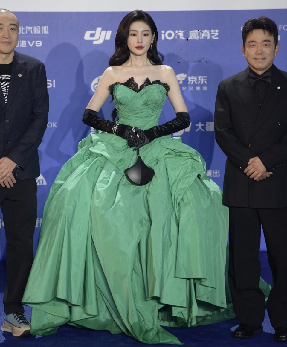张天爱五官精致立体,一袭绿色修身长裙,勾勒出完美身材曲线,可惜礼服略显厚重,少了几分灵动轻盈。