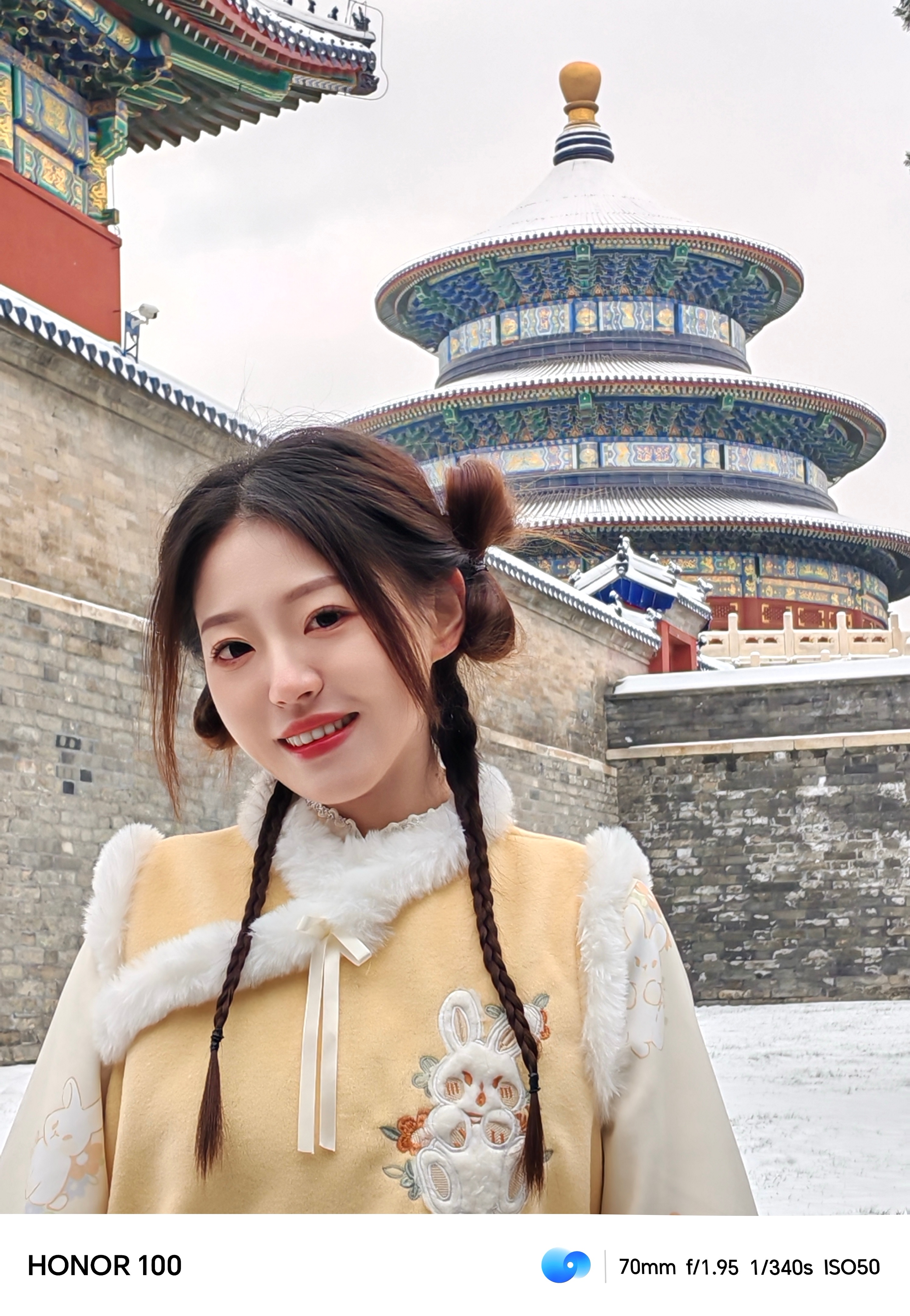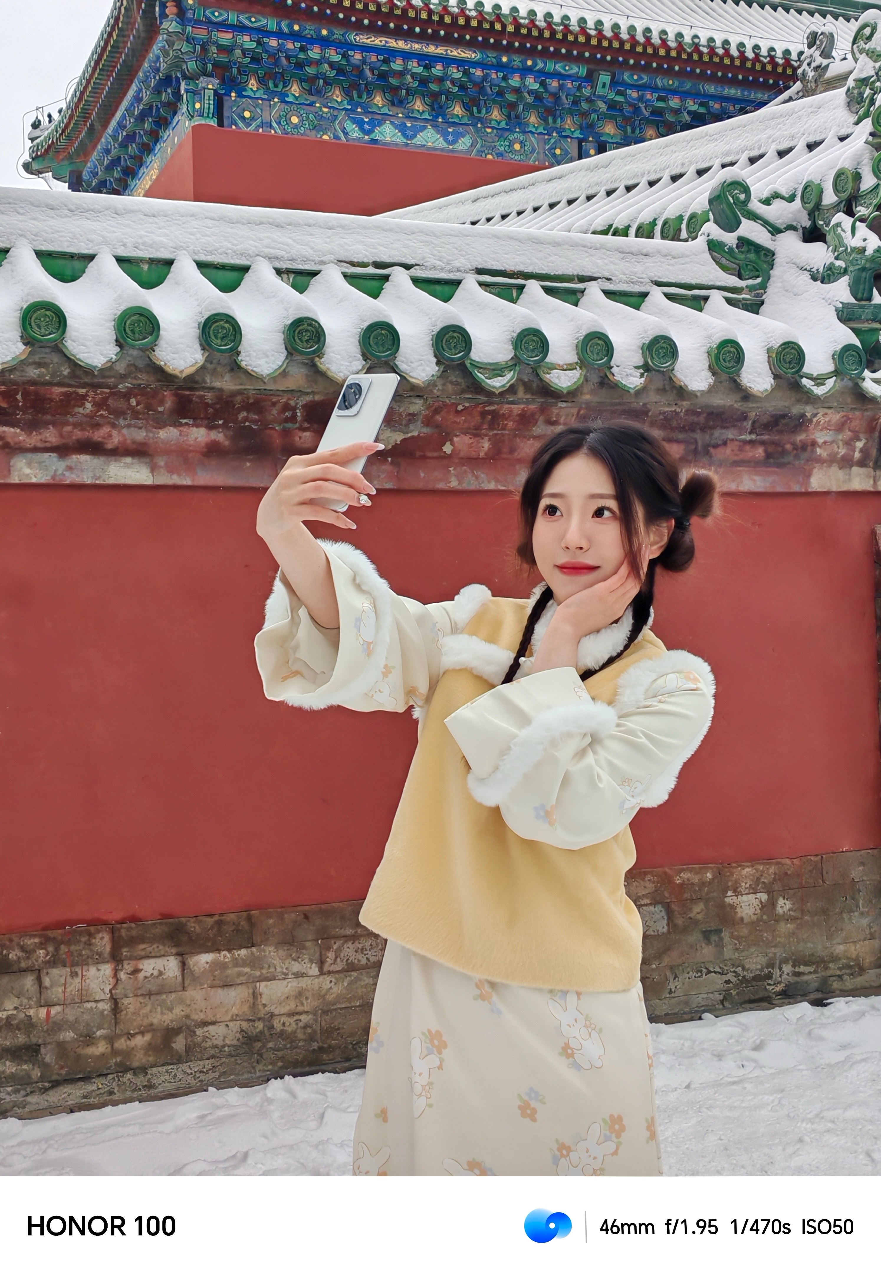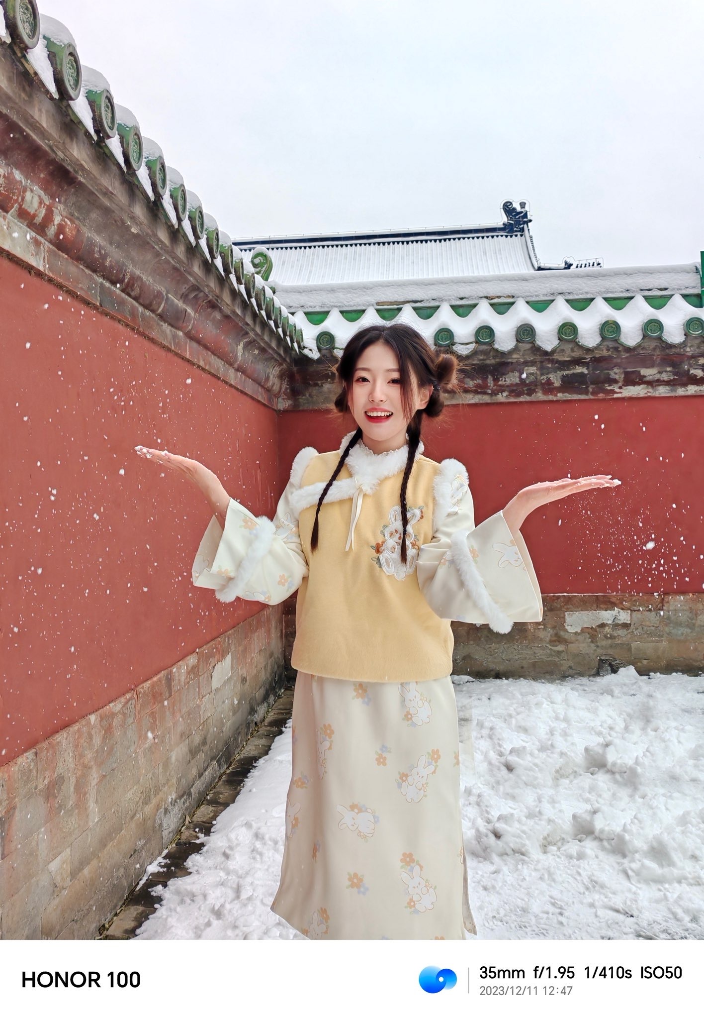 #北京的雪#来啦!这次好给面子,雪下得这么大,立刻拉上小伙伴拿着#荣耀100#去了天坛,下雪的天坛配上新中式真的好出片!不得不说新出的荣耀100真的太好用了,他的面部黄金比例算法和AI RAW算法搭配出来的图堪比单反质感,保证质感的同时还还原了美貌,真的很难不爱!大家可以试试看~