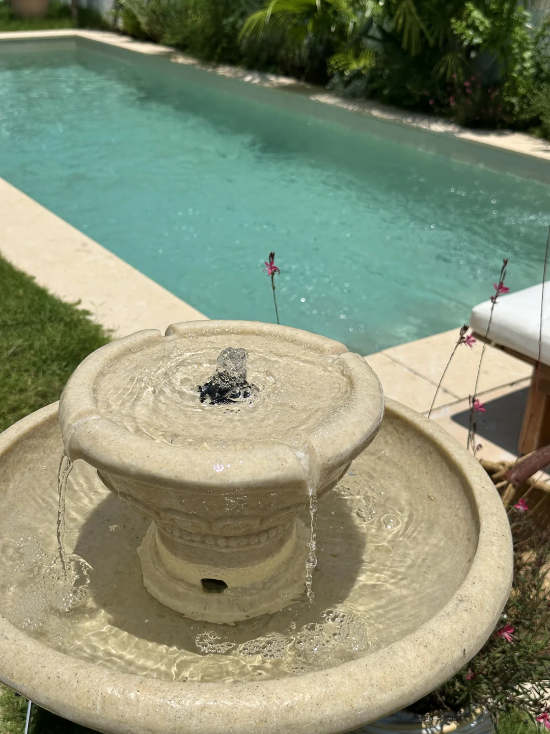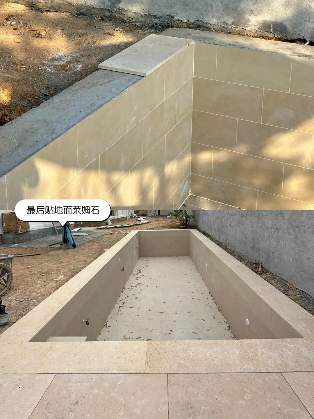 🧱地面砖用的莱姆石,池内用了低吸水率的佛山本地瓷砖来代替西班牙砖,填缝用的是米黄色填缝剂