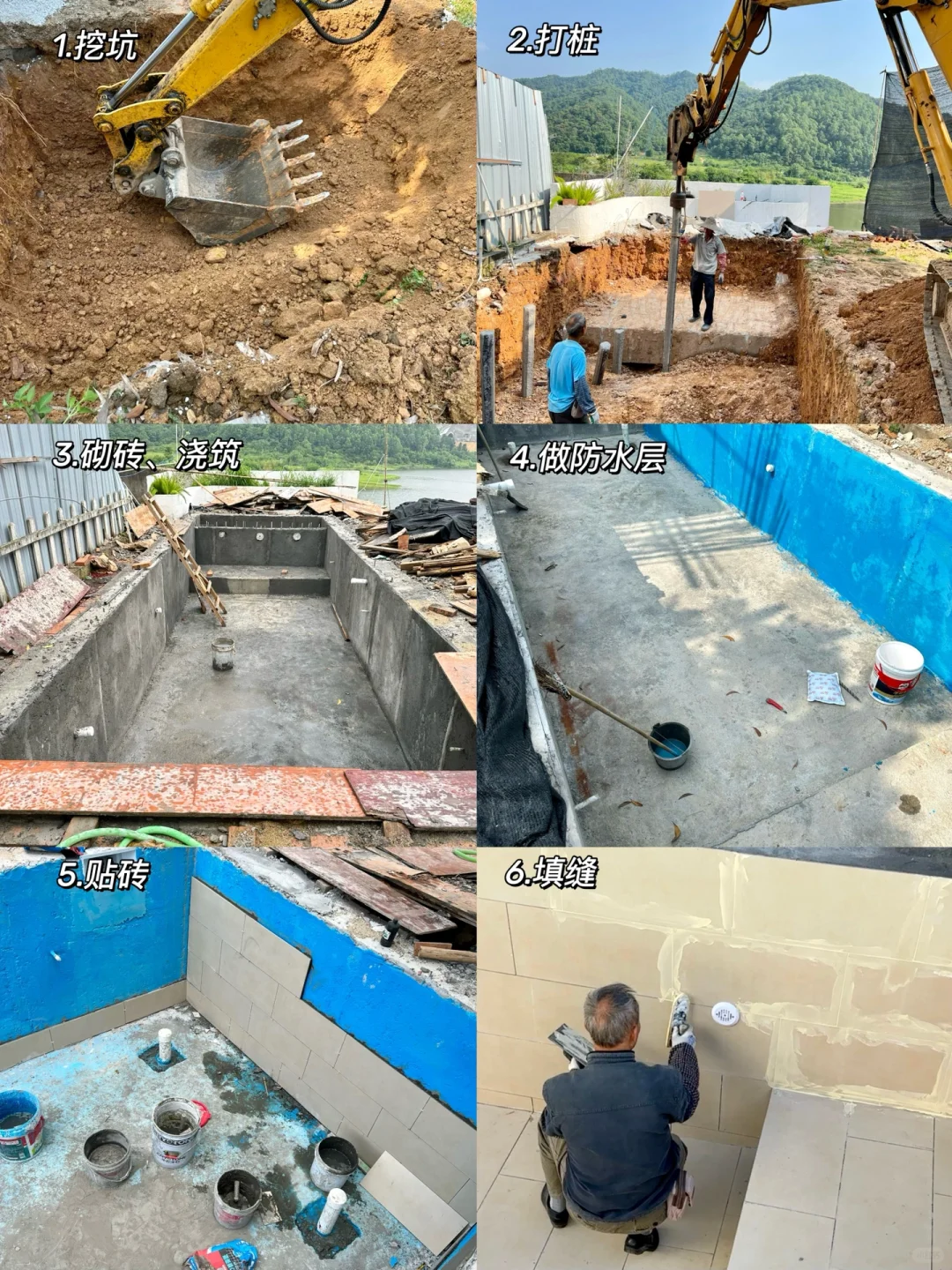 一般承包给当地的建筑商即可,从开始的地基打桩、砌泳池、做方水、到贴砖填缝基本不用操心