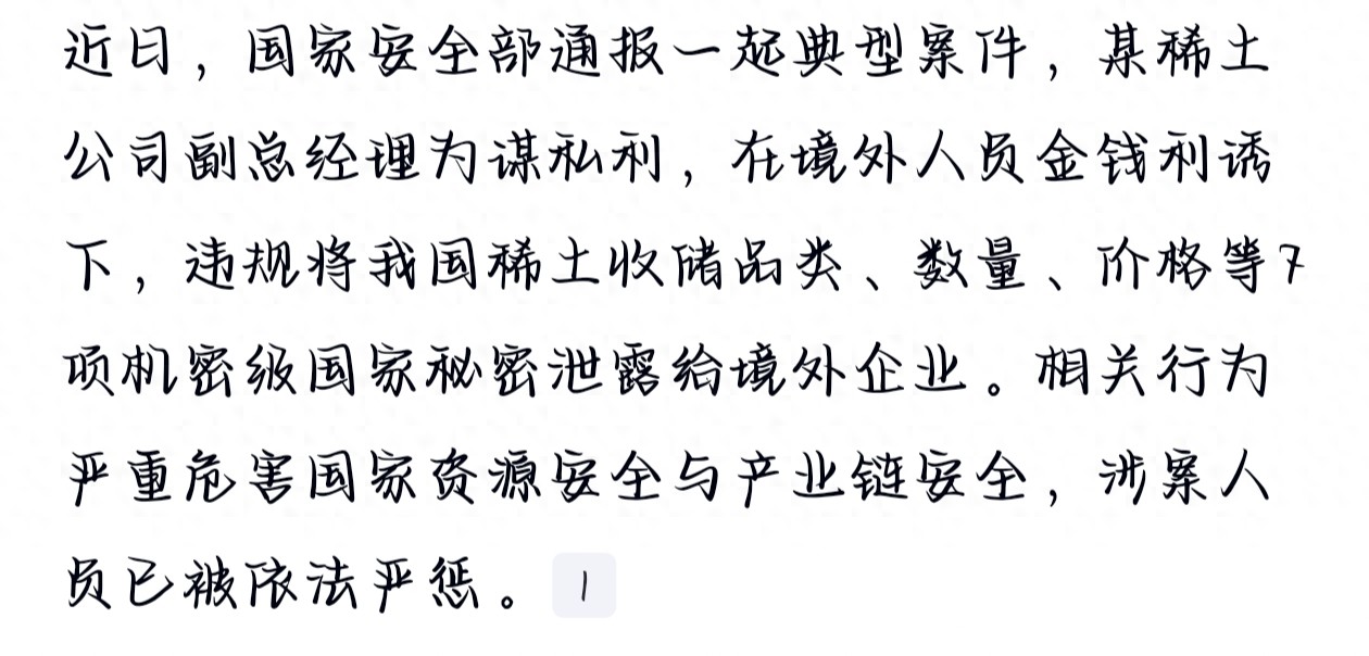 写到这里,不禁让人深思:稀土作为国家战略资源,在境外势力的高度关注下,产业链上哪怕一个微小的“缺口”,都可能给国家带来难以估量的损失。维护国家安全不仅仅是国安机关的责任,更是我们每一个人的义务。