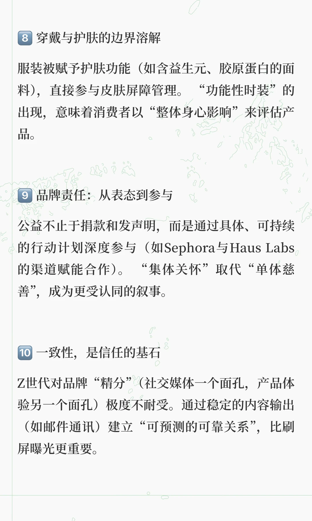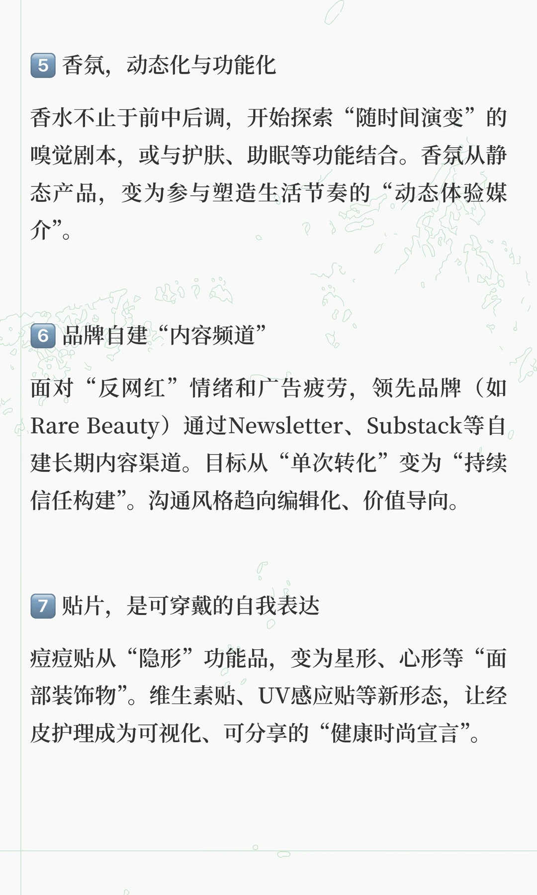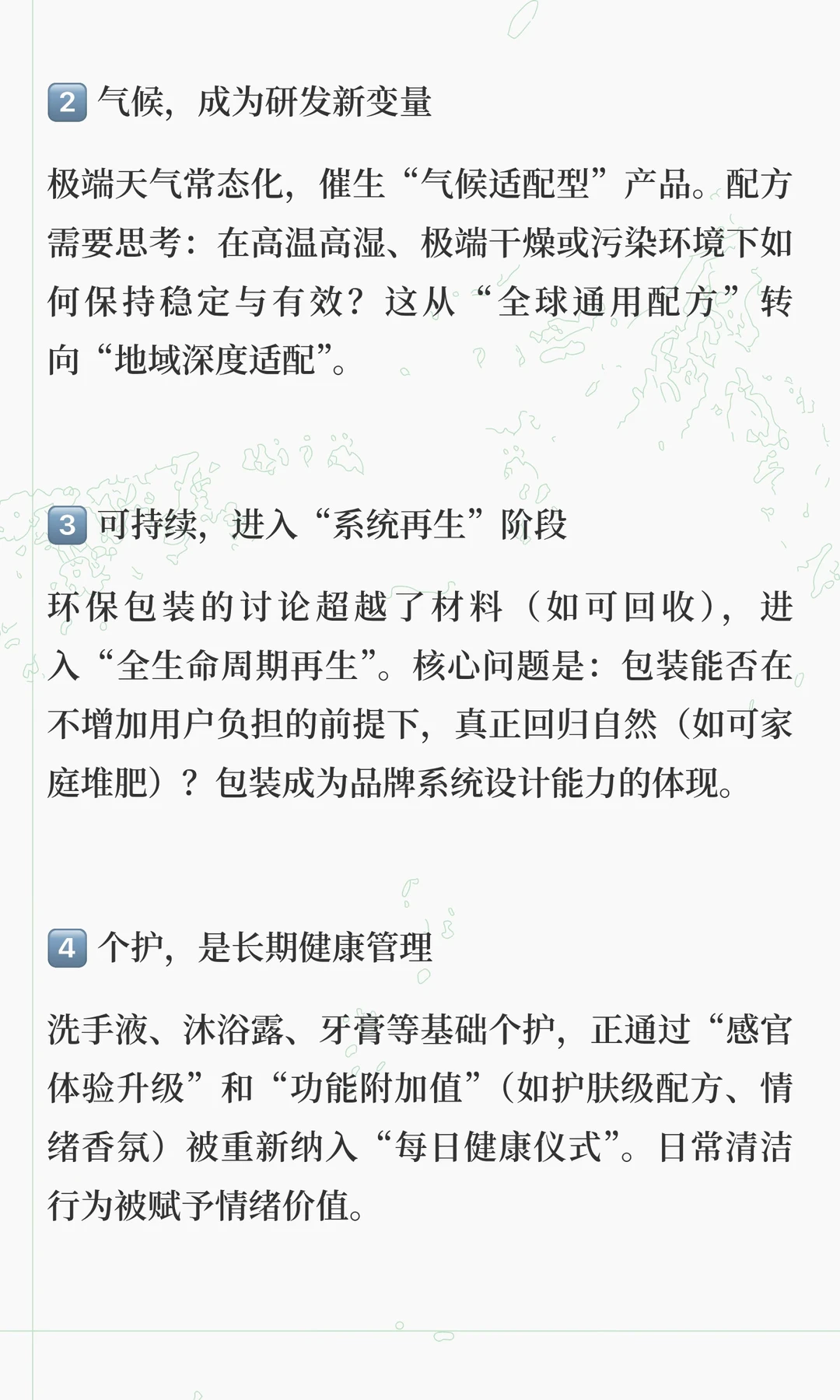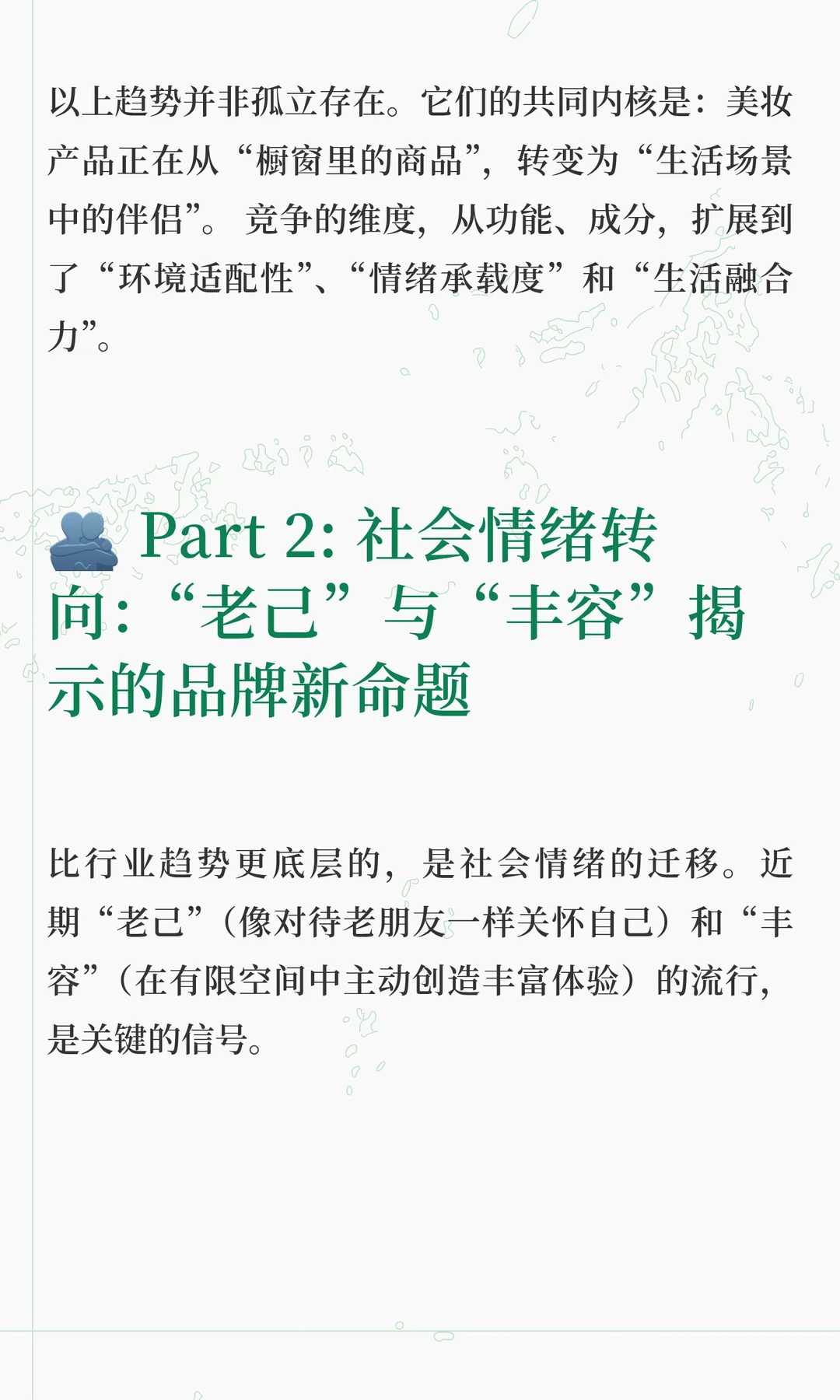 美妆未来将从功能导向转向生活体验,注重情绪承载、气候适配和可持续性。品牌需从“教育者”转型为“共创者”,通过内容建设、产品设计和品牌责任,成为用户日常生活的伴侣,提供关怀与仪式感。