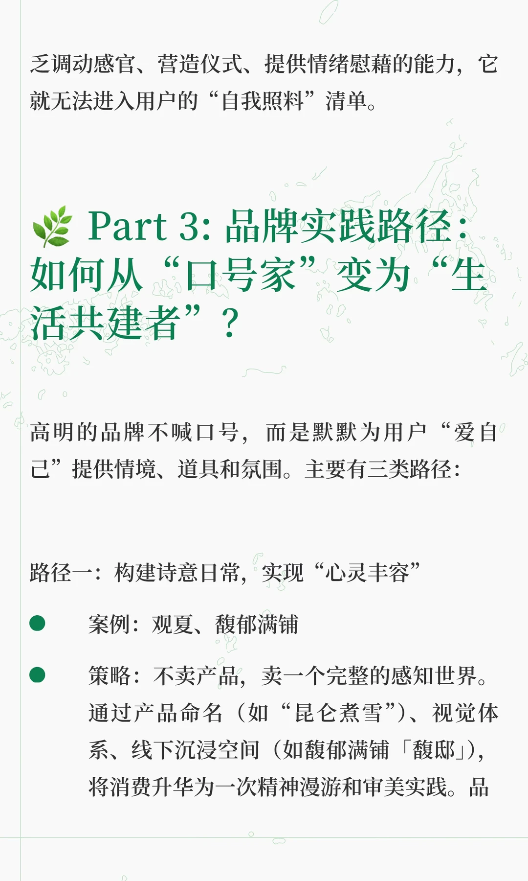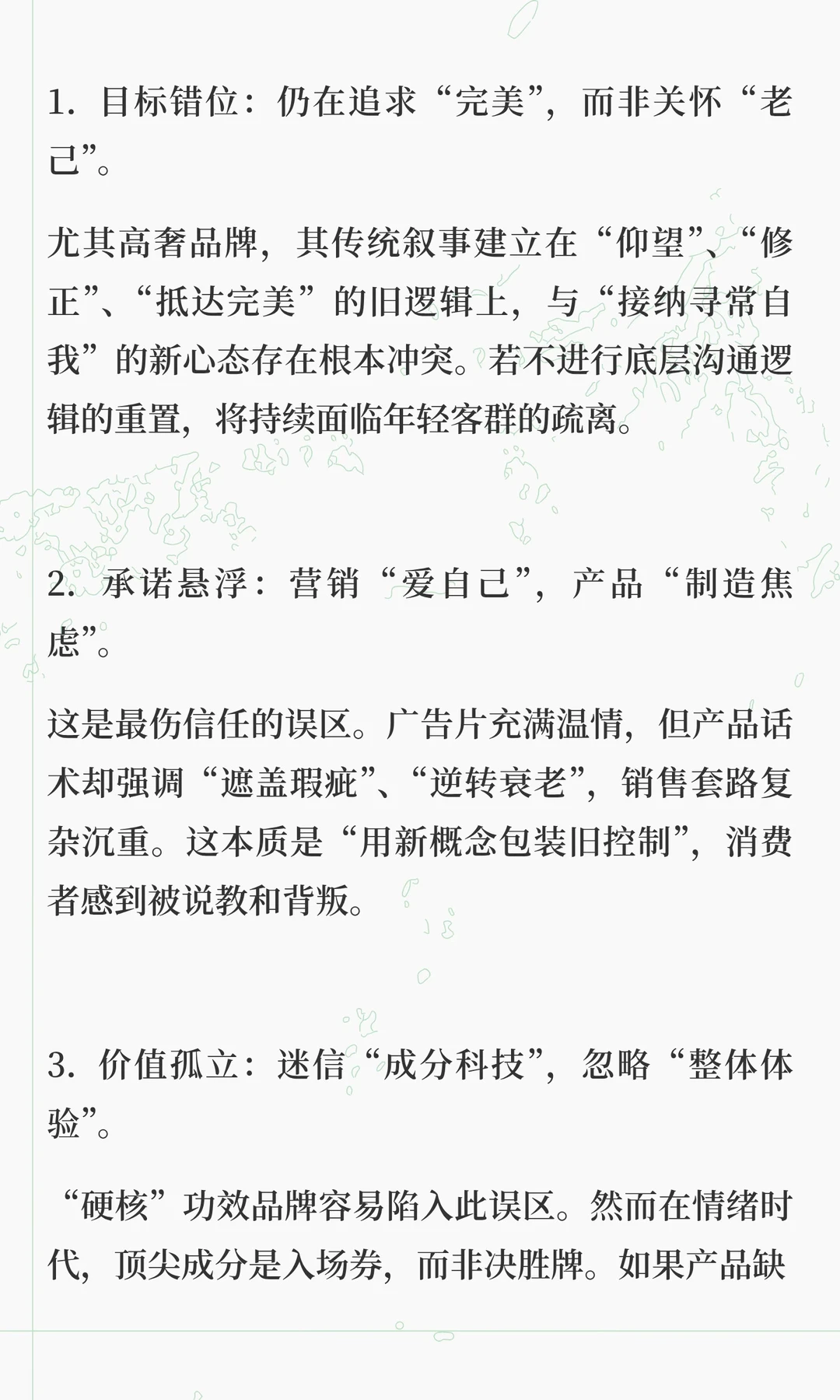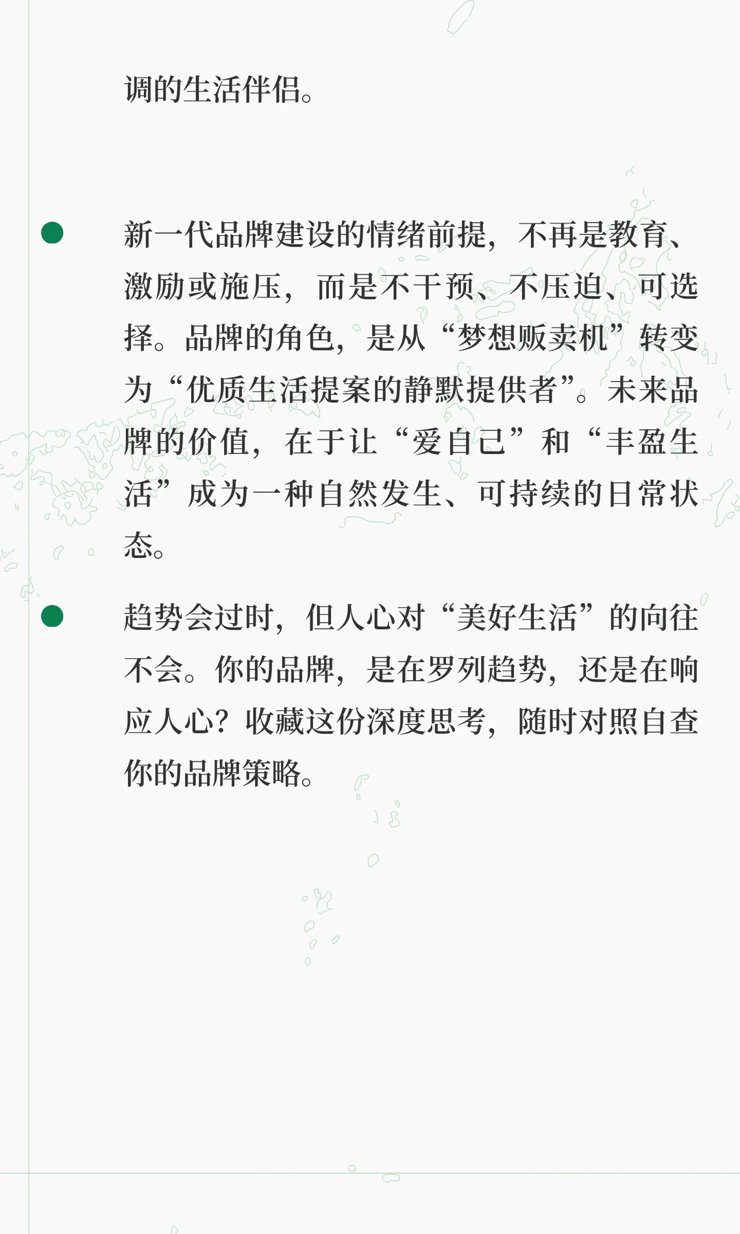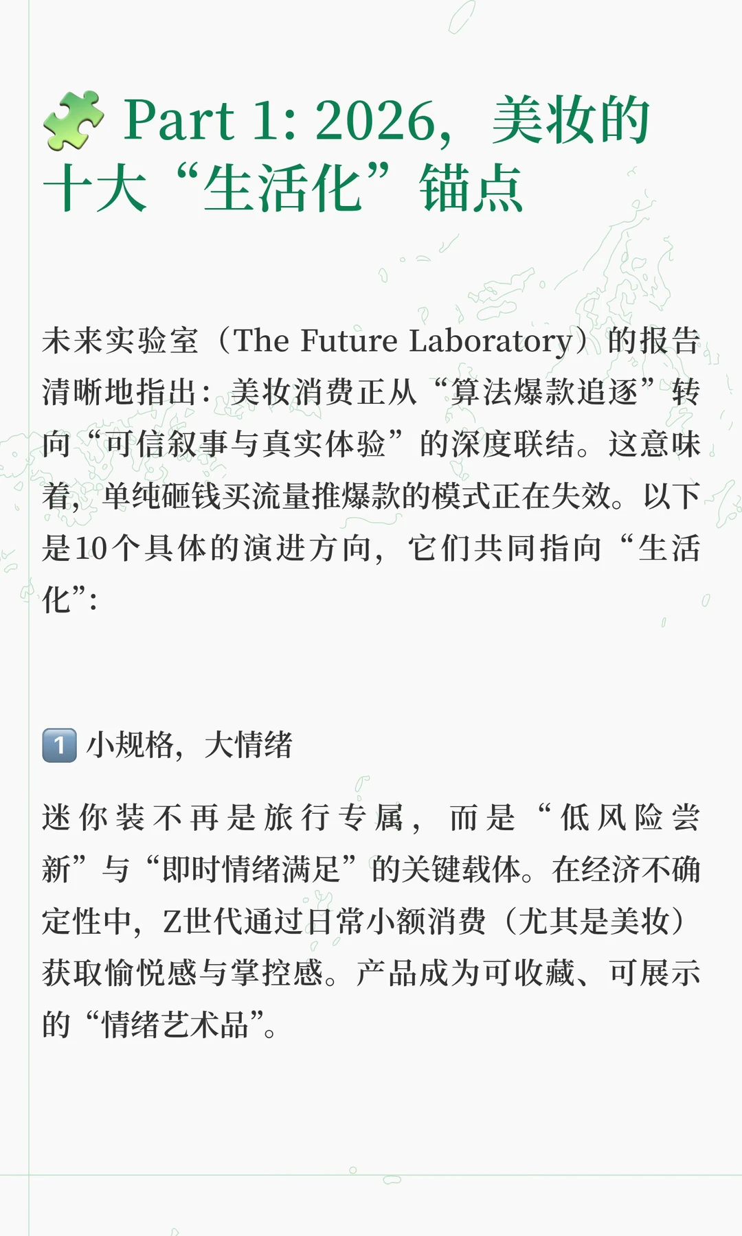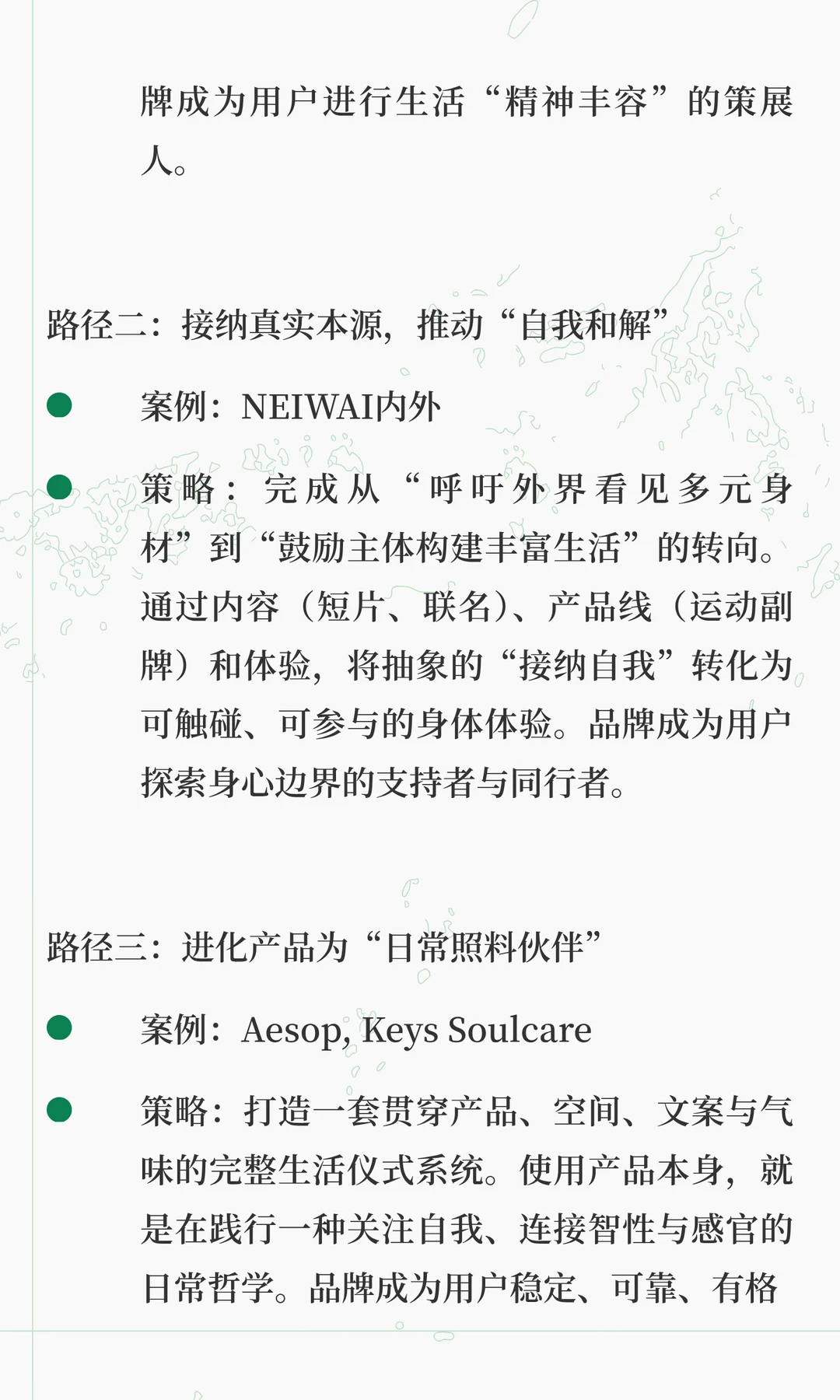 美妆未来将从功能导向转向生活体验,注重情绪承载、气候适配和可持续性。品牌需从“教育者”转型为“共创者”,通过内容建设、产品设计和品牌责任,成为用户日常生活的伴侣,提供关怀与仪式感。