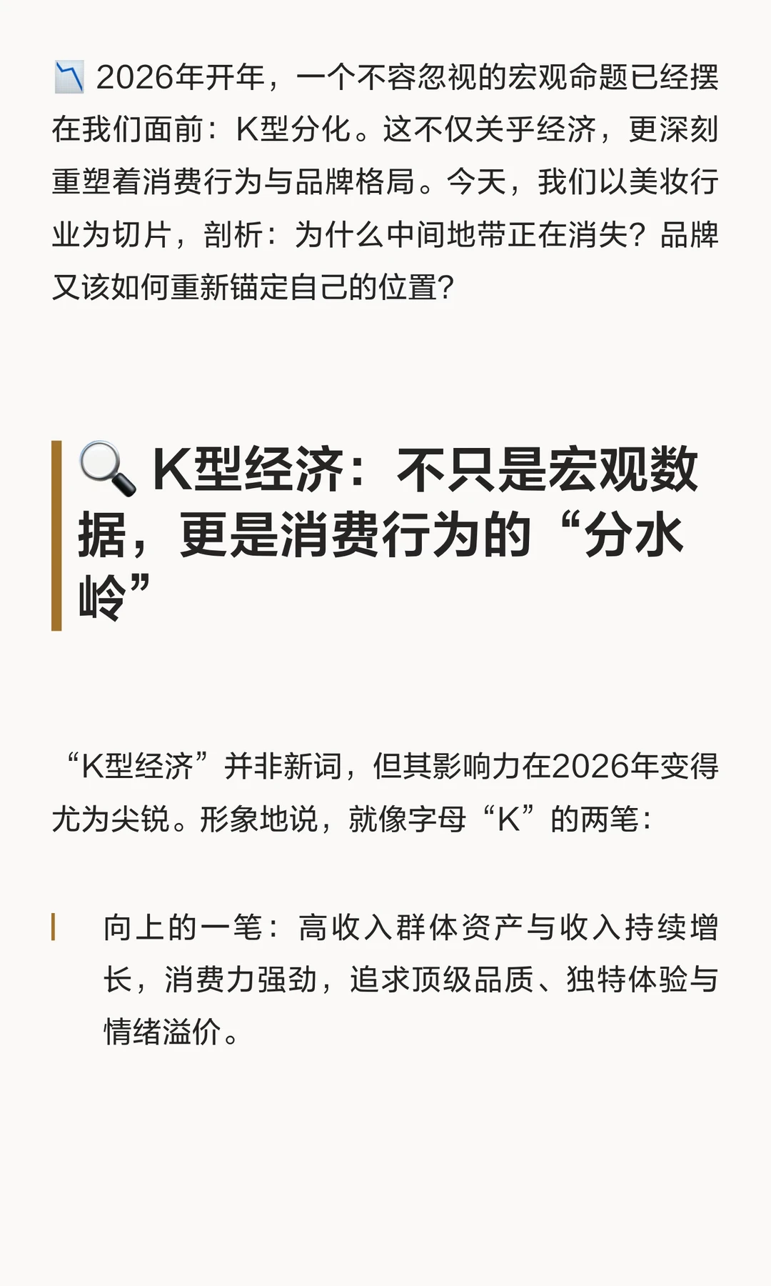 2026年K型分化重塑消费行为,高奢与平价品牌增长,中端品牌受挤压。消费者转向精明消费,成分党主导,韩妆复兴,平替文化盛行。品牌需调整策略,向上突破或向下扎根,或深耕场景解决方案,清晰定位才能在分化中生存。