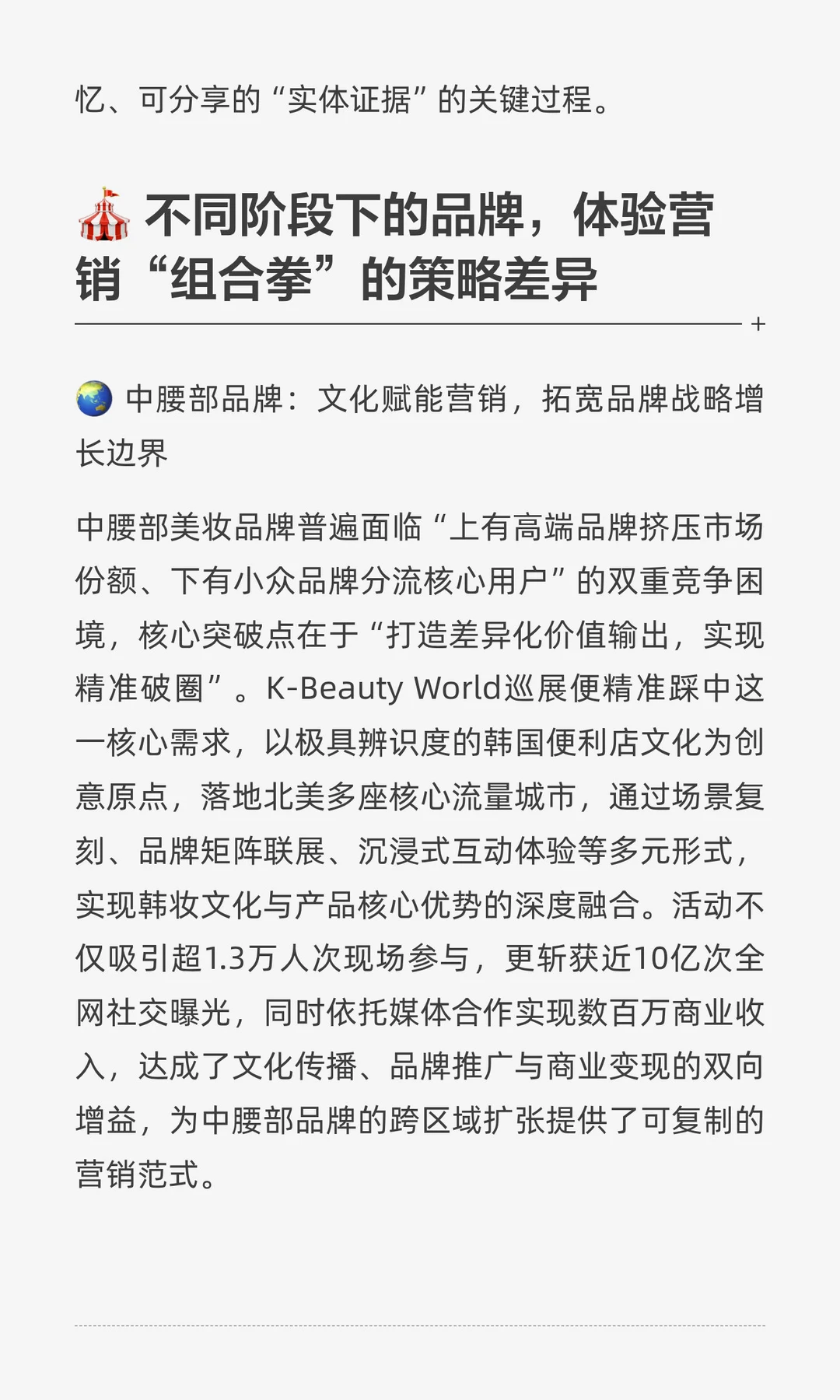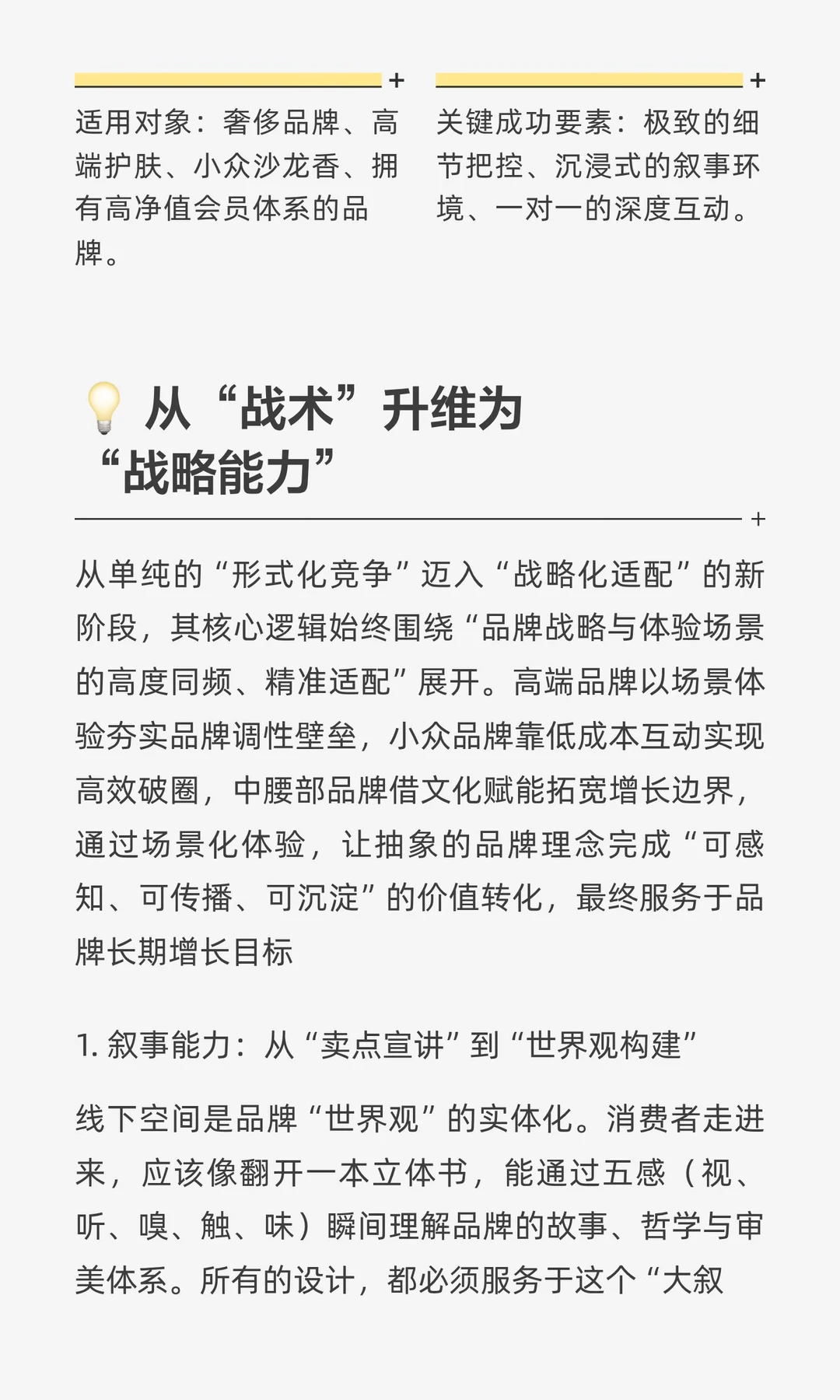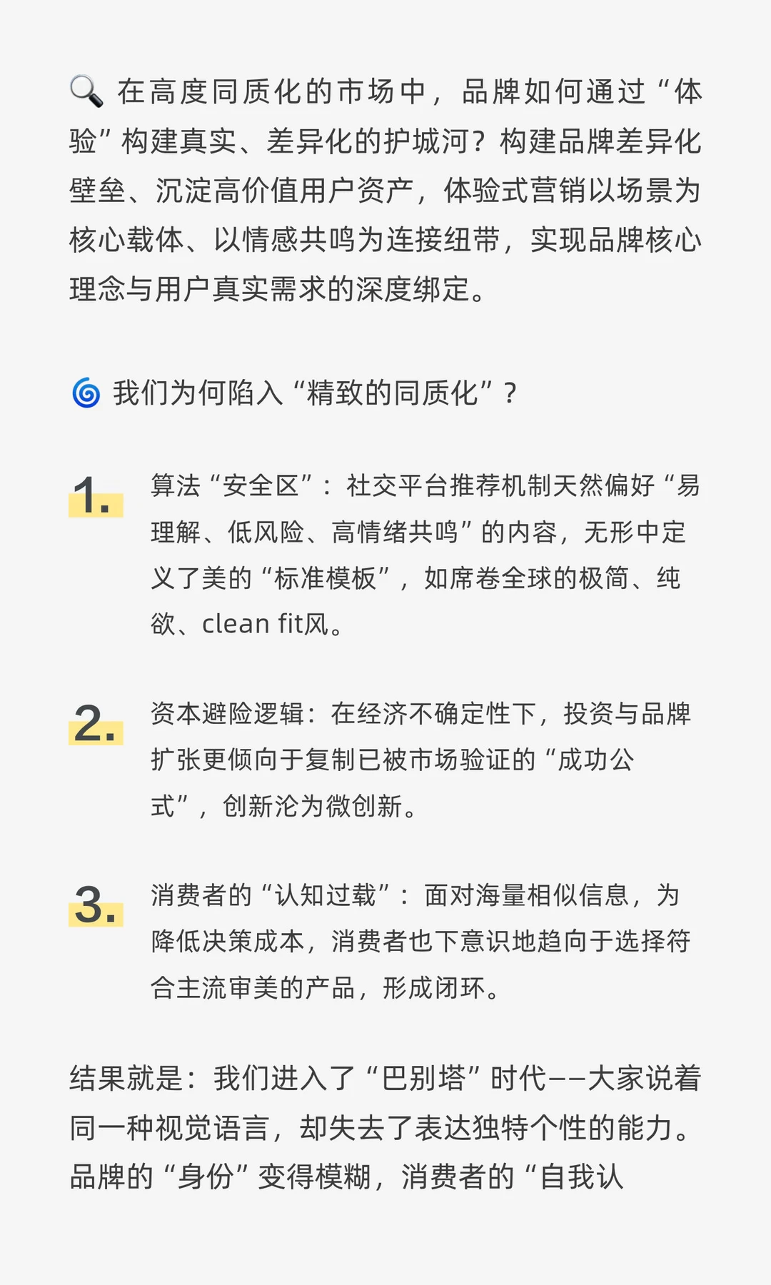 品牌通过体验营销构建差异化的护城河,以场景和情感共鸣吸引用户。中腰部品牌通过文化赋能破圈,小众品牌低成本互动高效破圈,高端品牌沉浸式叙事深化忠诚度。体验营销成为品牌战略核心。