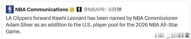 NBA官方:莱昂纳德增补入选2026年全明星赛 填补美国队人数缺口