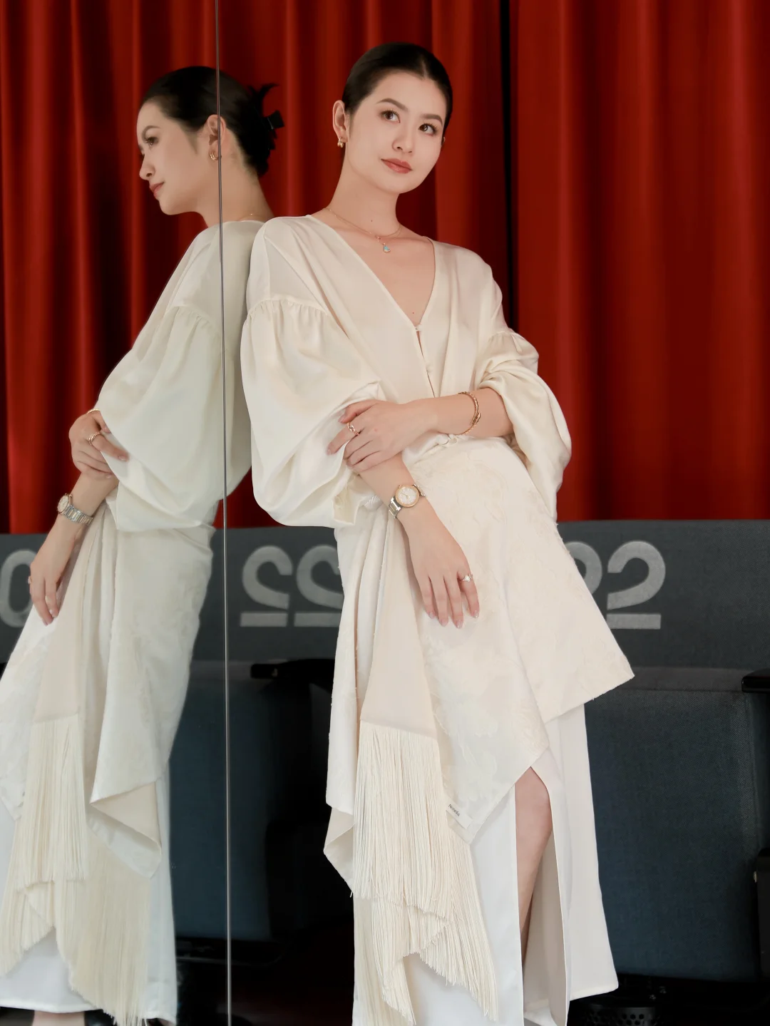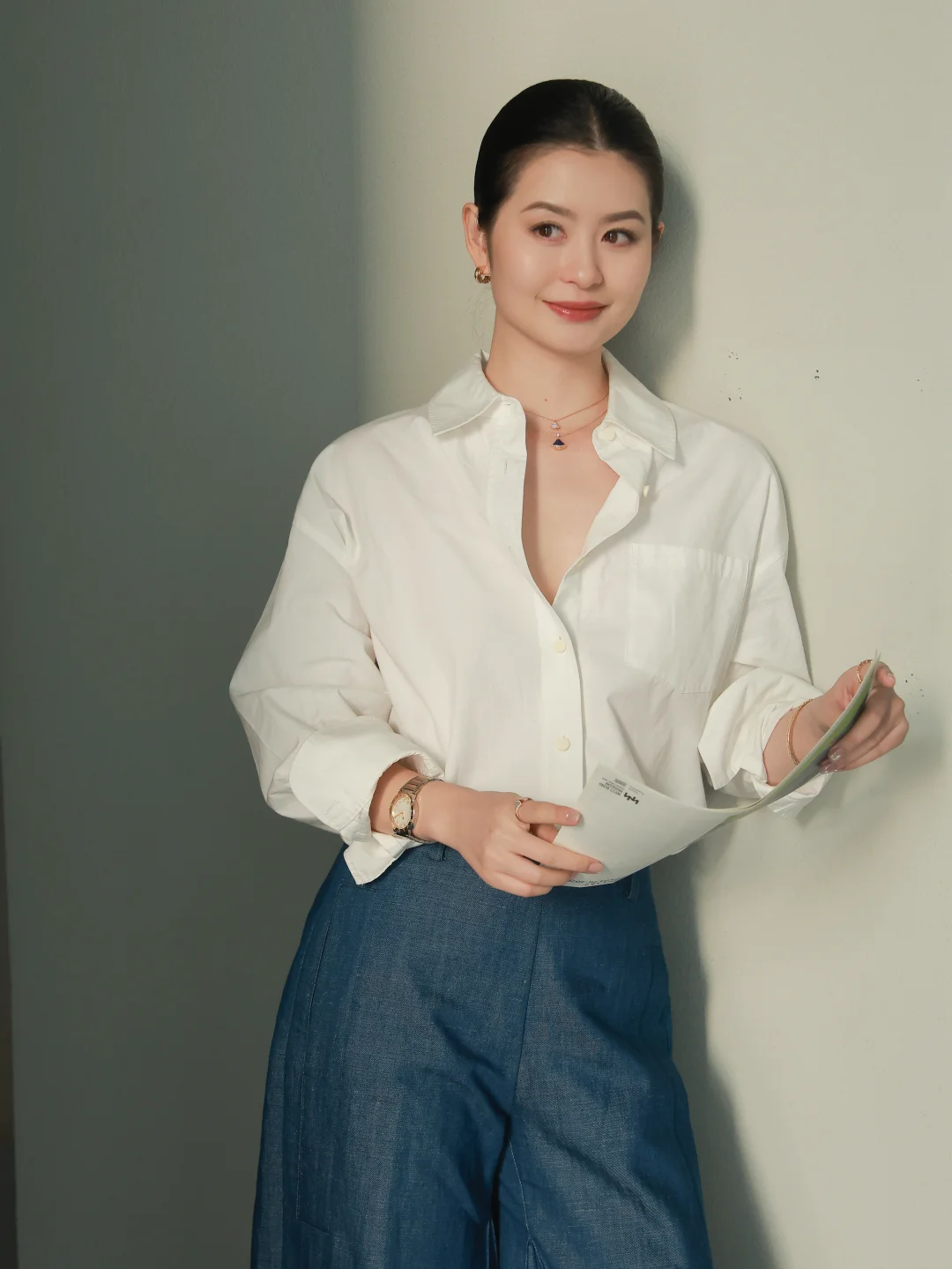 耳饰和手镯换成了白贝母,它的气质很温润、很自洽。