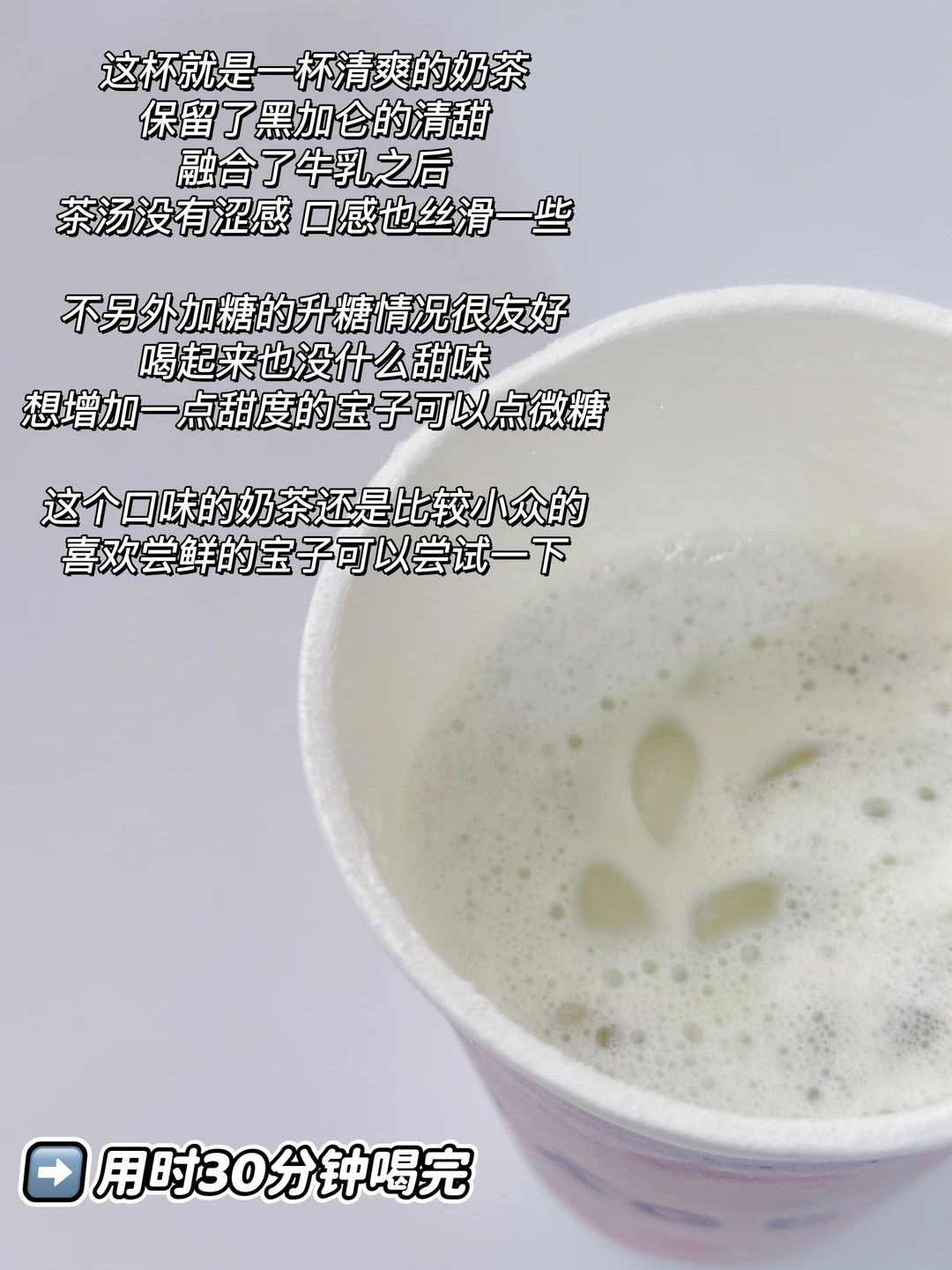这杯就是一杯清爽的奶茶,保留了黑加仑的清甜,融合了牛乳之后,茶汤没有涩感,口感也丝滑一些〰️不另外加糖的升糖情况很友好,喝起来也没什么甜味,想增加一点甜度的宝子可以点微糖〰️这个口味的奶茶还是比较小众的,喜欢尝鲜的宝子可以尝试一下[暗中观察R]