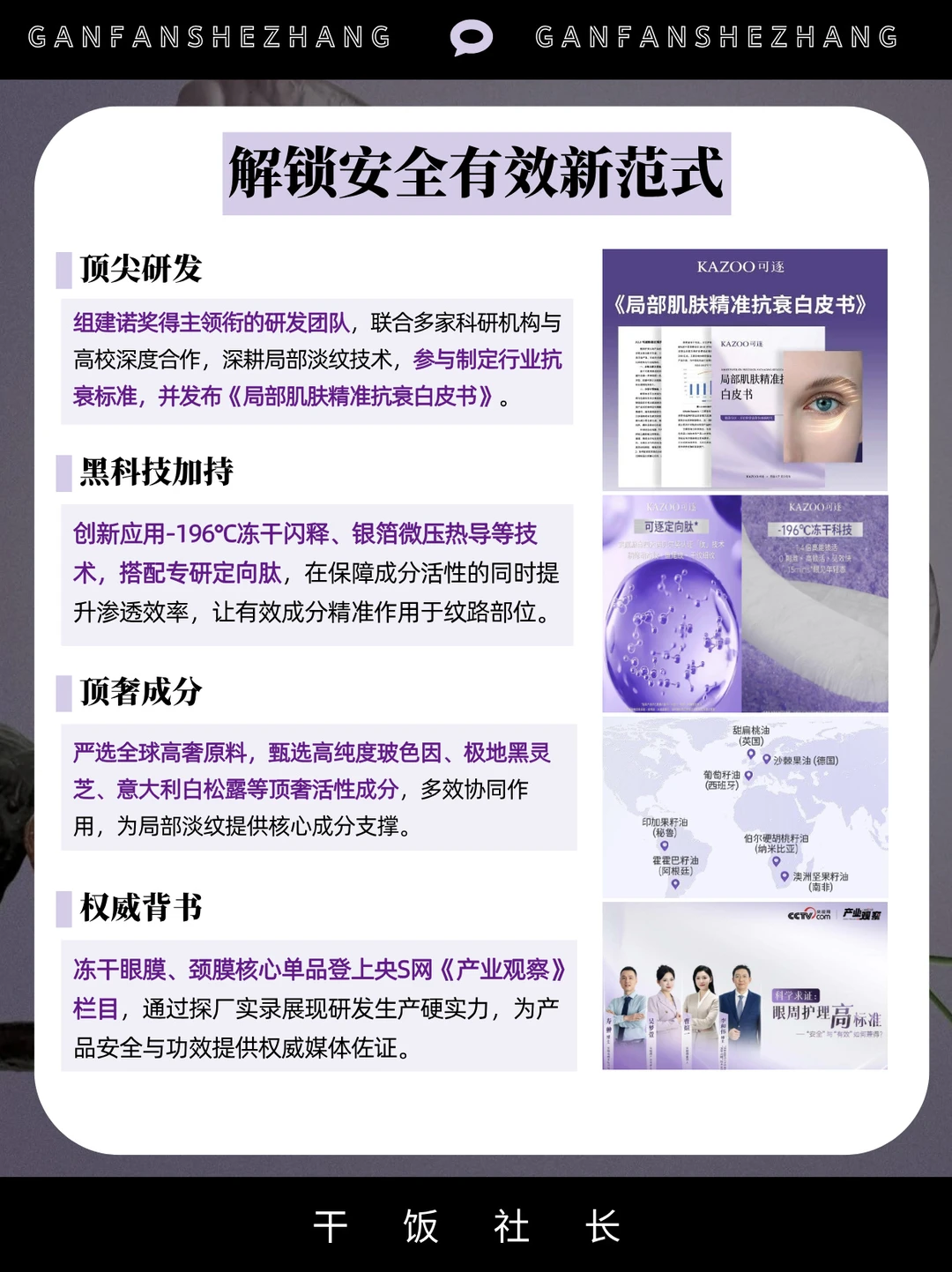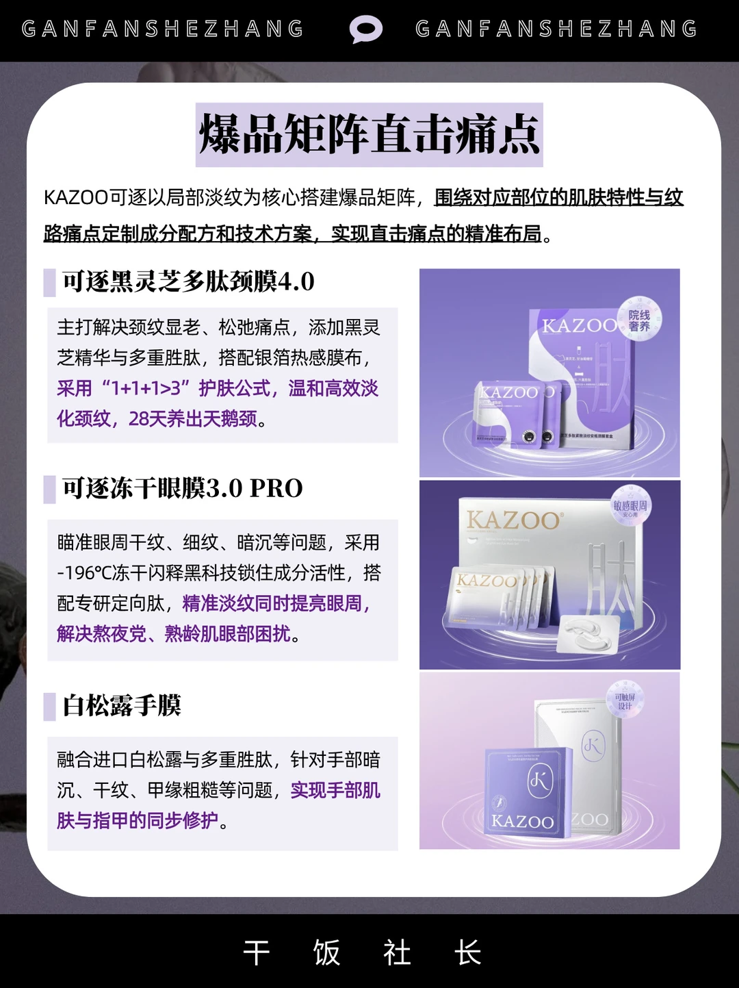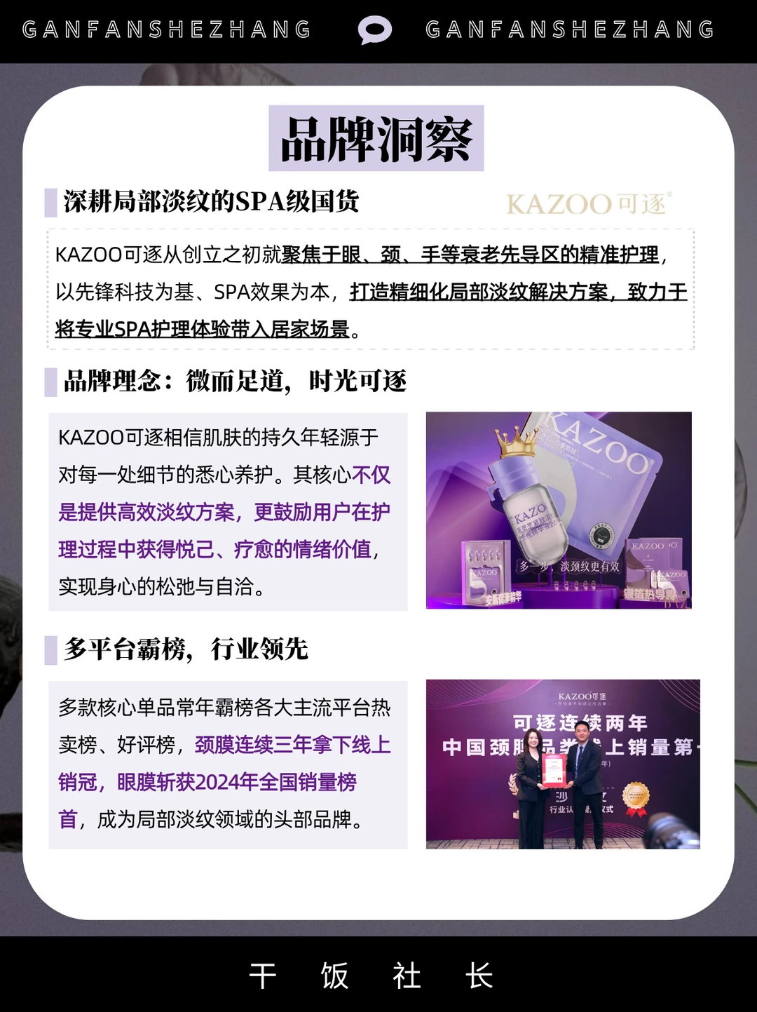 在这一赛道红利下,大批品牌争相入局,而KAZOO可逐凭借亮眼表现成为最大黑马,不仅连续三年拿下颈膜品类线上销冠、眼膜2024年全国销量冠军,多款单品更常年霸榜各大电商榜单榜首位置,这样的成绩让我不禁好奇,这家聚焦局部淡纹的国货品牌,究竟凭何站稳细分赛道头部位置❓