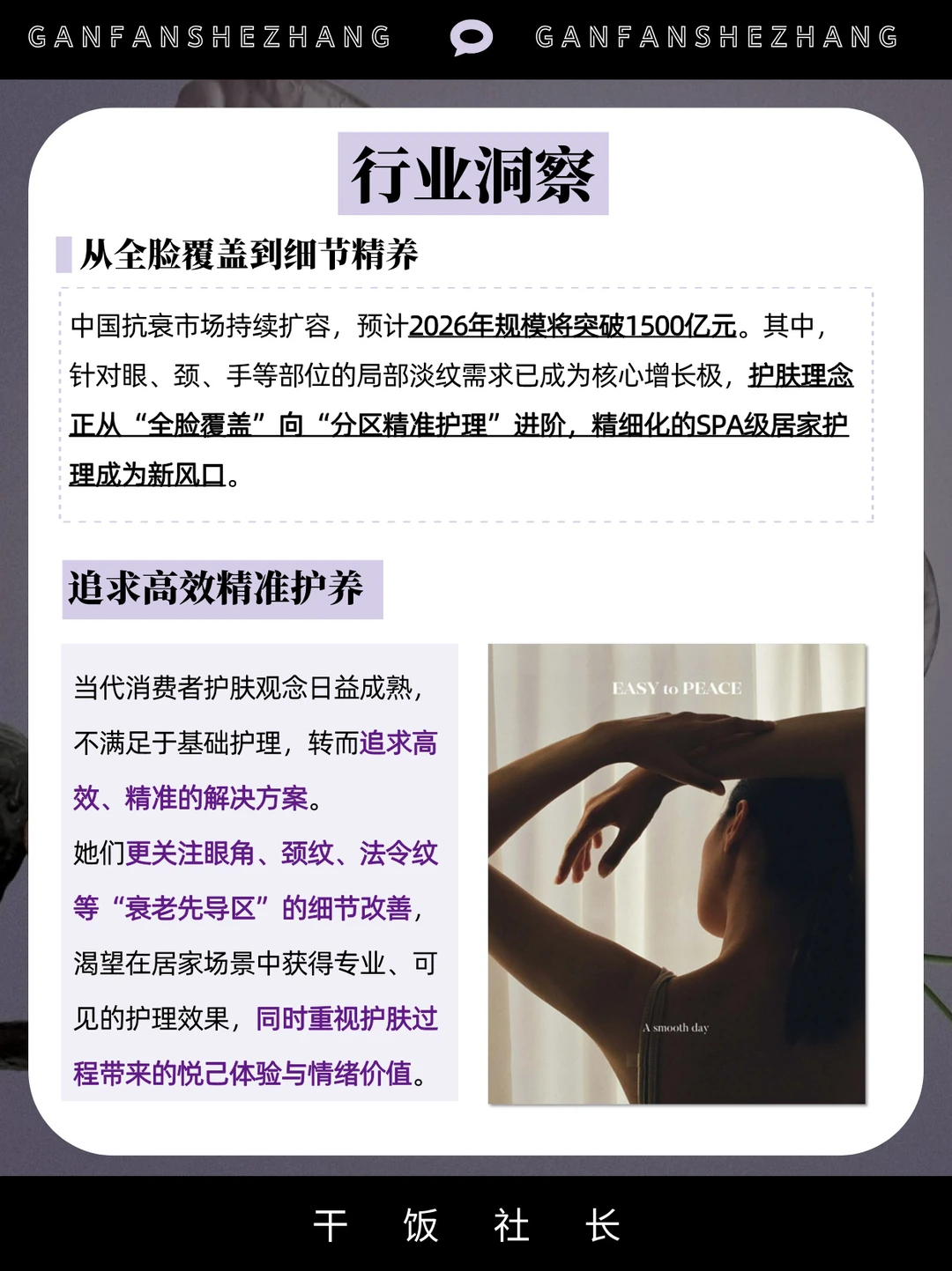 据欧睿国际报告显示,中国抗衰市场预计2026年突破1532亿元,其中针对眼、颈、手等局部淡纹的细分需求成核心增长极。