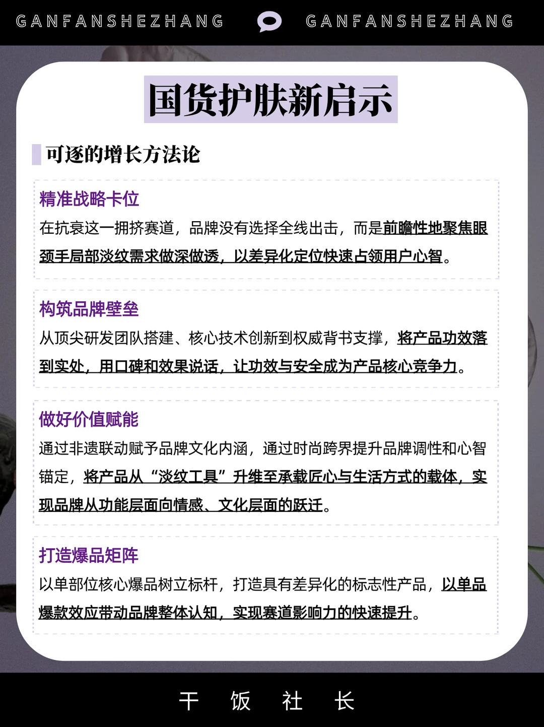 第1⃣是赛道聚焦,放弃全脸护肤的宽泛竞争,以“局部淡纹”这一精准需求,快速占领用户心智;