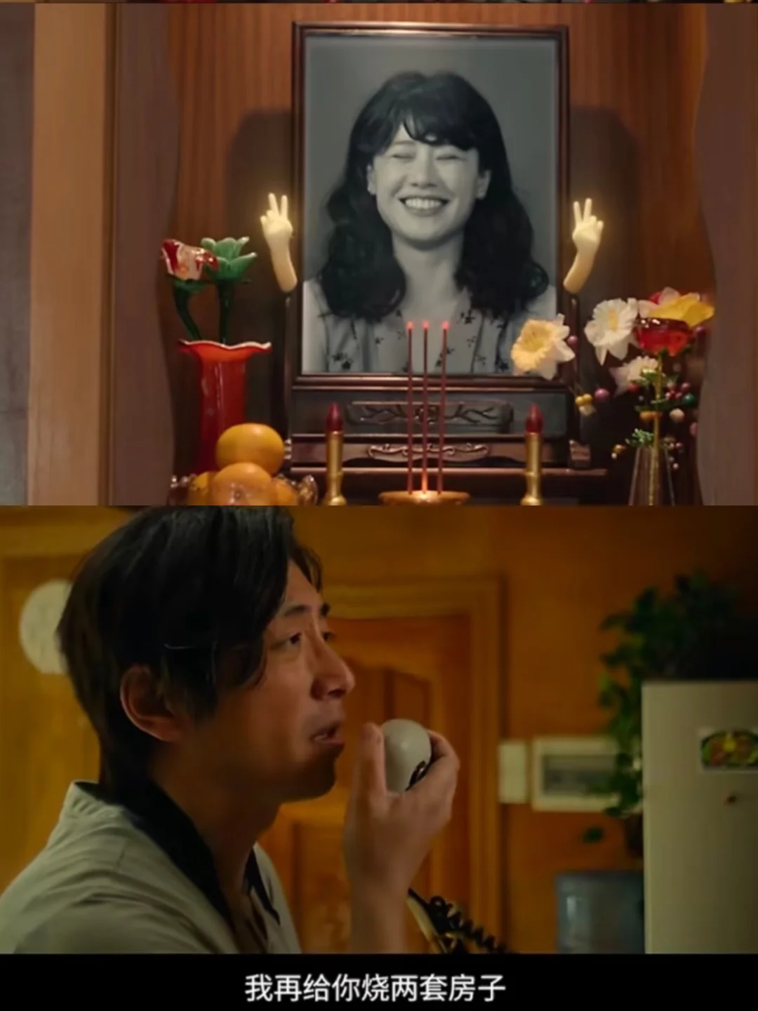 还有白客 演的爸爸,用对讲机和“天上的老婆”通话,搞“赛博上香”,这些细节既荒诞又可爱,把失去亲人的沉重感消解得恰到好处。