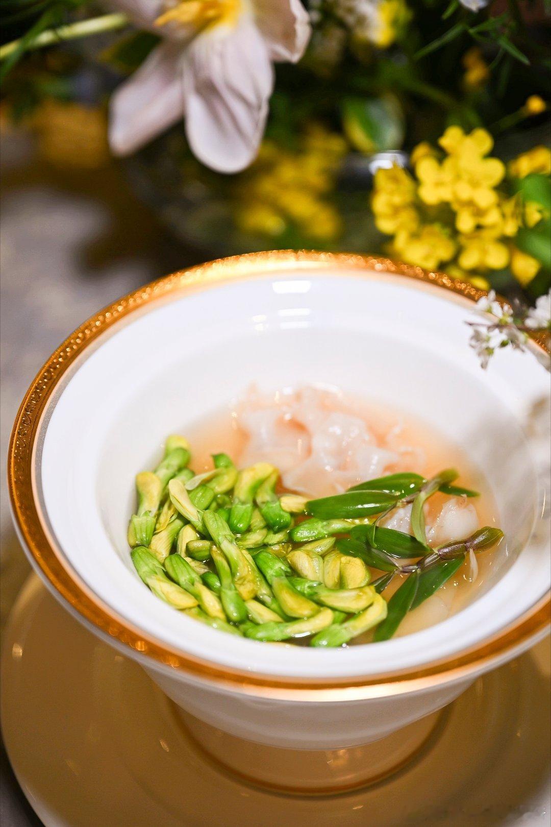 暖汤百合金雀花象拔汤盅清润得不像一道汤,更像是在喝春天。慢炖鸡汤的底味上,金雀花的清甜、百合的润,层层往上走,非常舒服。