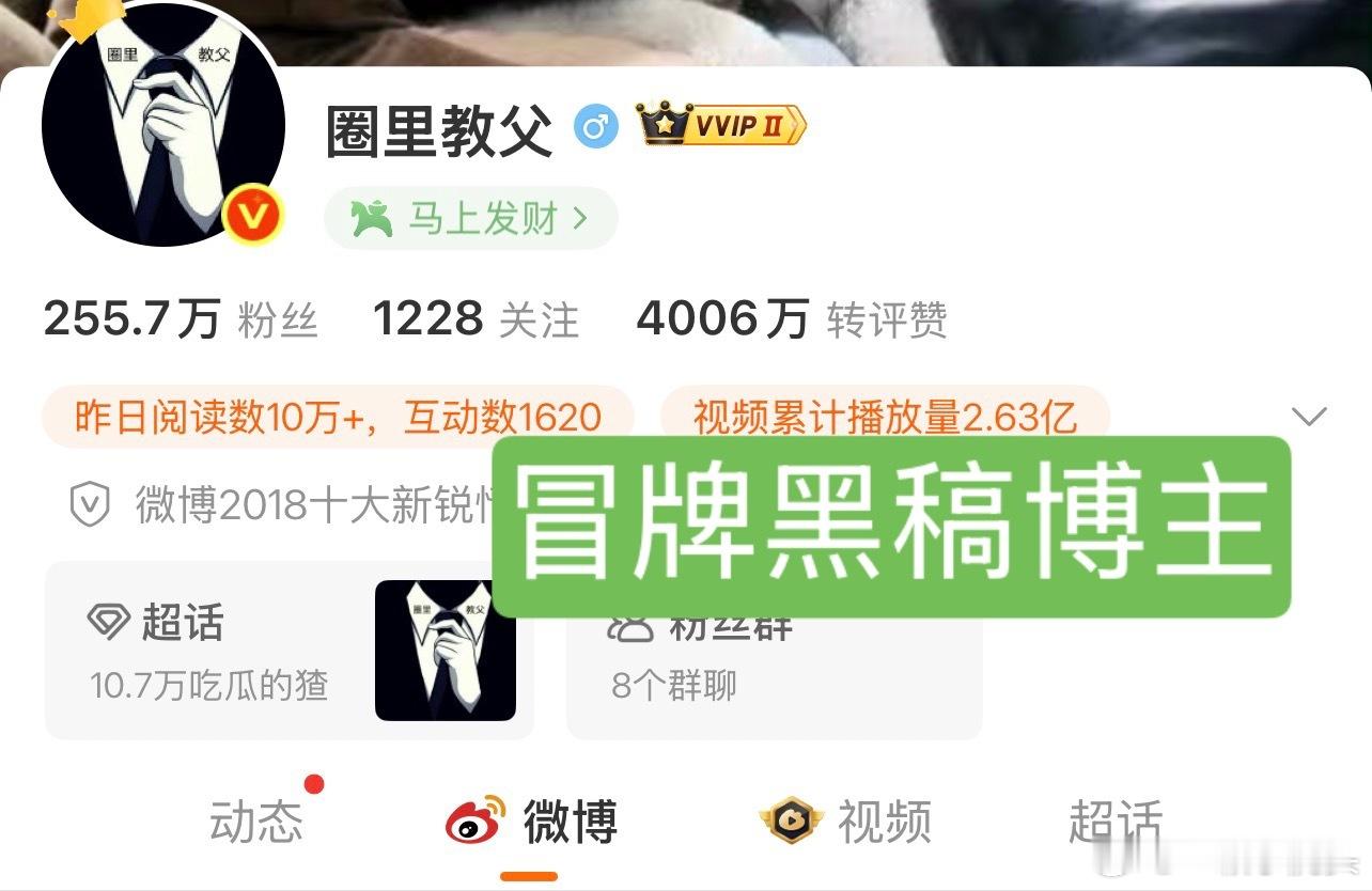 这个两百万粉的【圈里教父】是冒牌的,真正的叫【圈内教父】有1000万粉,冒牌的那个去年给肖战搞了很多黑热搜,明显有问题,还会删小飞侠的控评。大家认清楚账号,不要误伤。