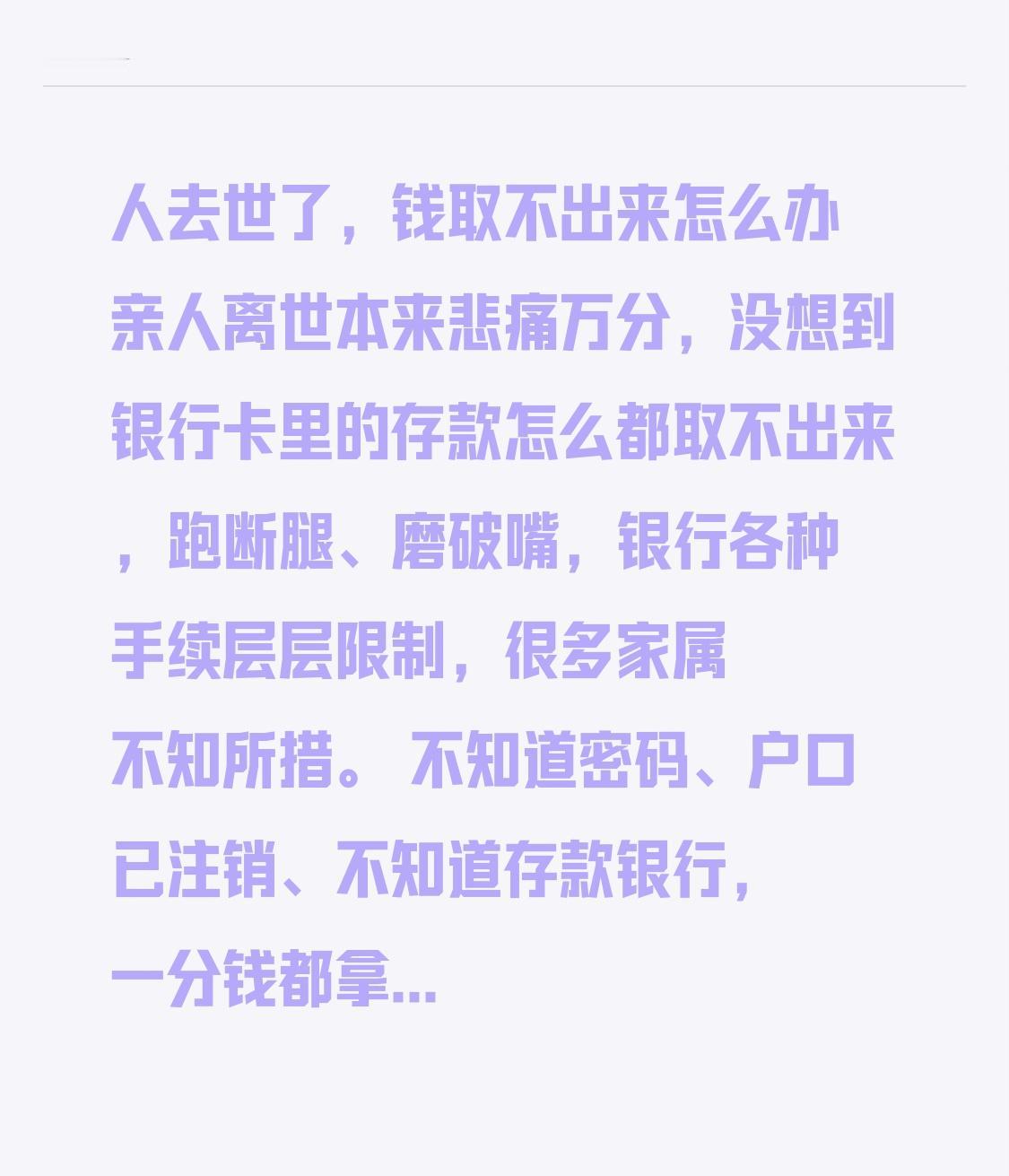 亲人离世本来悲痛万分,没想到银行卡里的存款怎么都取不出来,跑断腿、磨破嘴,银行各种手续层层限制,很多家属不知所措。