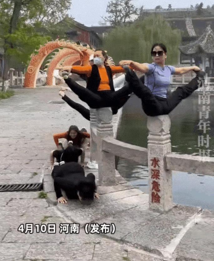 太尴尬了!河南新乡一景区,一群中年男女,在一湖岸边栏杆上,不但做着高难度的瑜伽动作,还有三人还在地上的“爬虫”式运动的一幕,愣是把路人和网友们都看得尴尬不已。