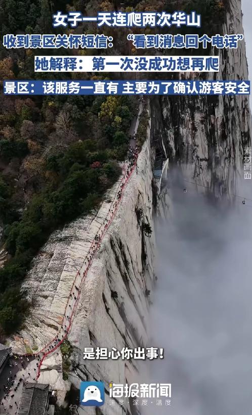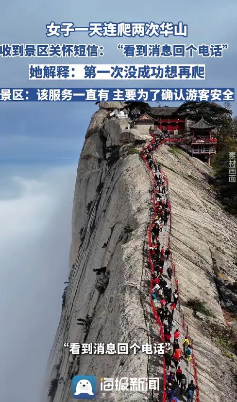 太暖心了!近日,游客卢女士在爬华山过程中第一次体力不支选择下山,晚上又买票复爬,没想到收到了景区关怀短信:看到消息回个电话,景区表示该服务一直有,主要为了确认游客安全。