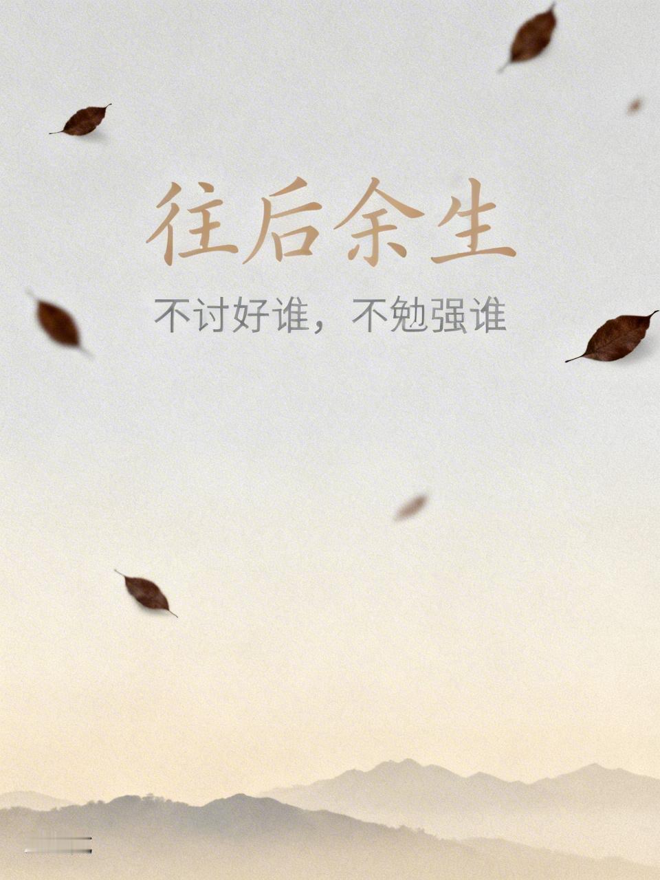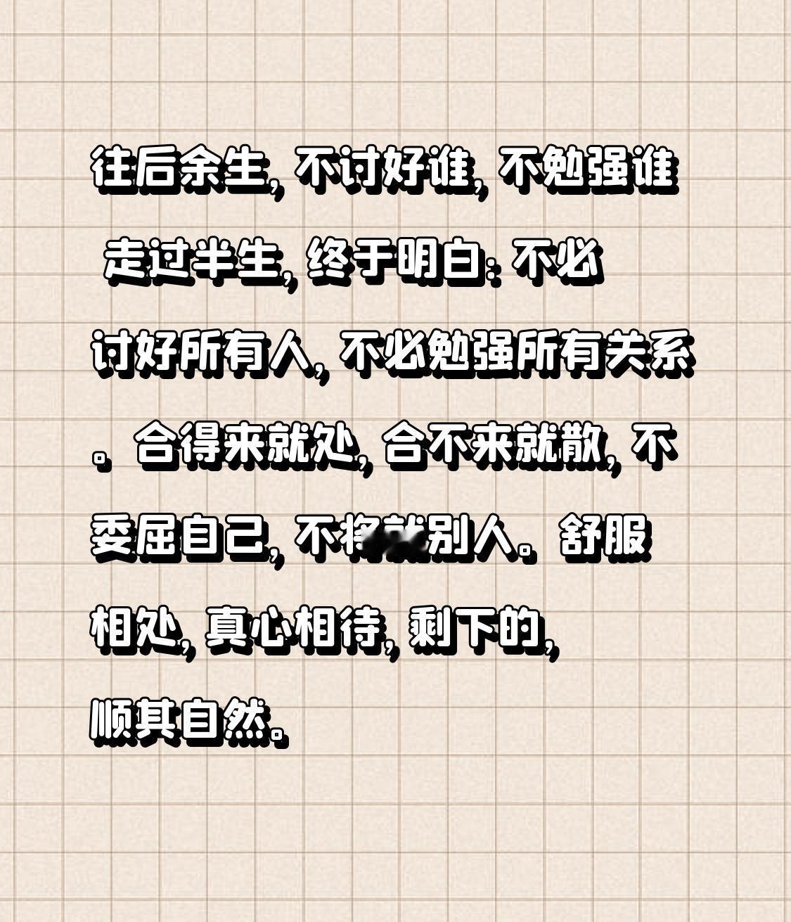 往后余生,不讨好谁,不勉强谁 走过半生,终于明白: 不必讨好所有人,不必勉强