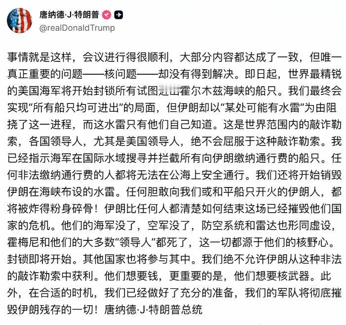 特朗普在公开表态中扬言,要以绝对军事力量掌控这条全球能源咽喉,彻底剥夺伊朗手中最后的战略筹码,逼迫伊朗在核问题、制裁解除等核心议题上无条件向美国低头。